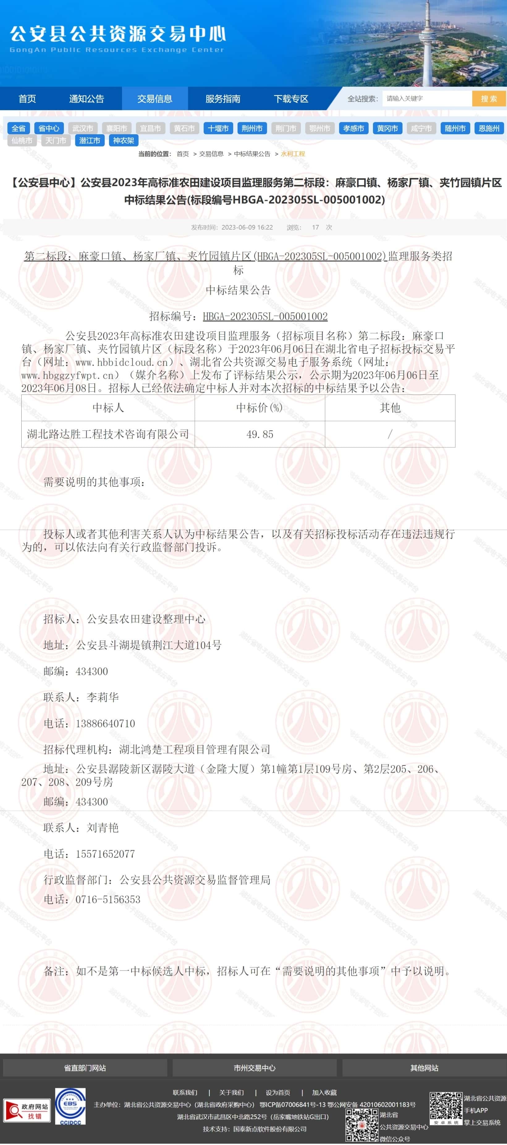 公安县2023年高标准农田建设项目监理服务第二标段中标结果公告
