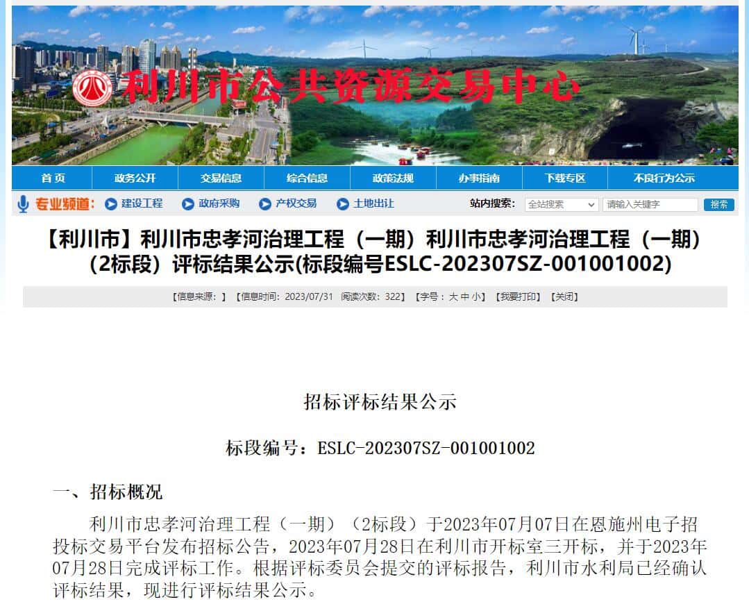 利川市忠孝河治理工程(一期)(2标段)于2023年07月07日在恩施州电子招投标交易平台发布招标公告,2023年07月28日在利川市开标室三开标,并于2023年07月28日完成评标工作。根据评标委员会提交的评标报告,利川市水利局已经确认评标结果,现进行评标结果公示。