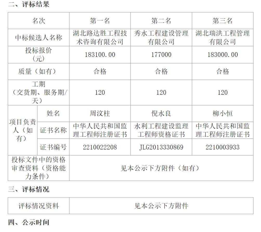 | 中标候选人名称 | 湖北路达胜工程技术咨询有限公司 | 秀水工程建设管理有限公司 | 湖北瑞洪工程管理有限公司 | |