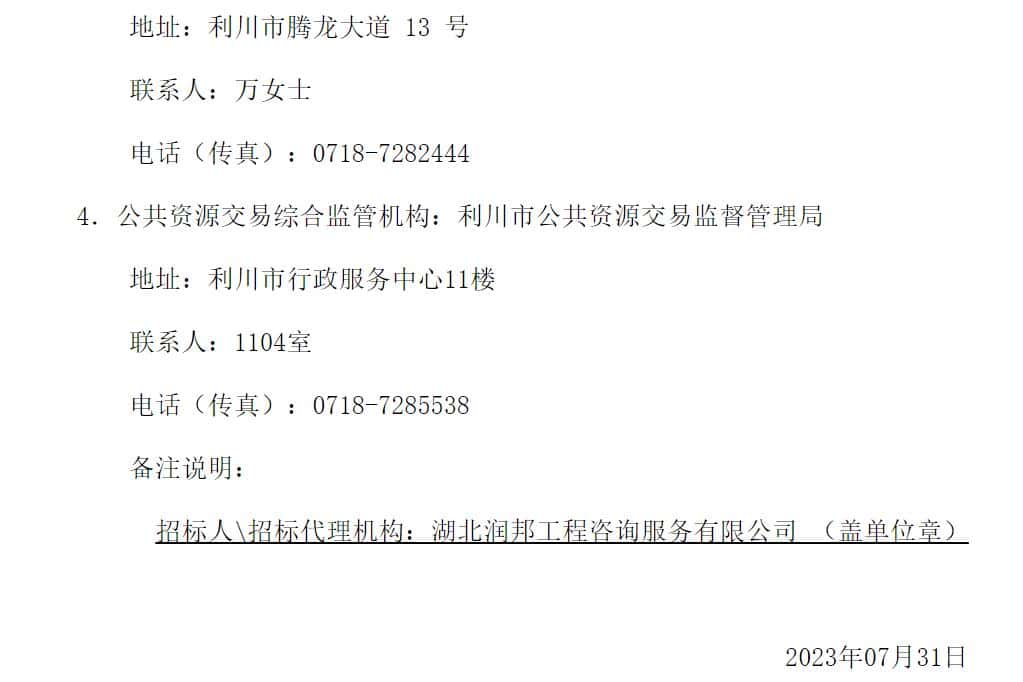 4.公共资源交易综合监管机构:利川市公共资源交易监督管理局