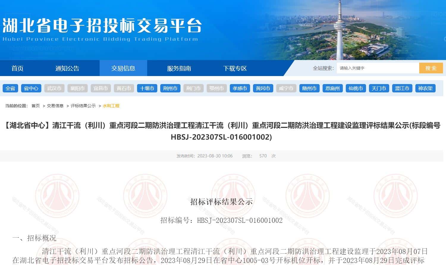 清江干流(利川)重点河段二期防洪治理工程清江干流(利川)重点河段二期防洪治理工程建设监理于2023年08月07日在湖北省电子招投标交易平台发布招标公告,2023年08月29日在省中心1005-03号开标机位开标,并于2023年08月29日完成评标工作。根据评标委员会提交的评标报告,利川市水利局已经确认评标结果,现进行评标结果公示。