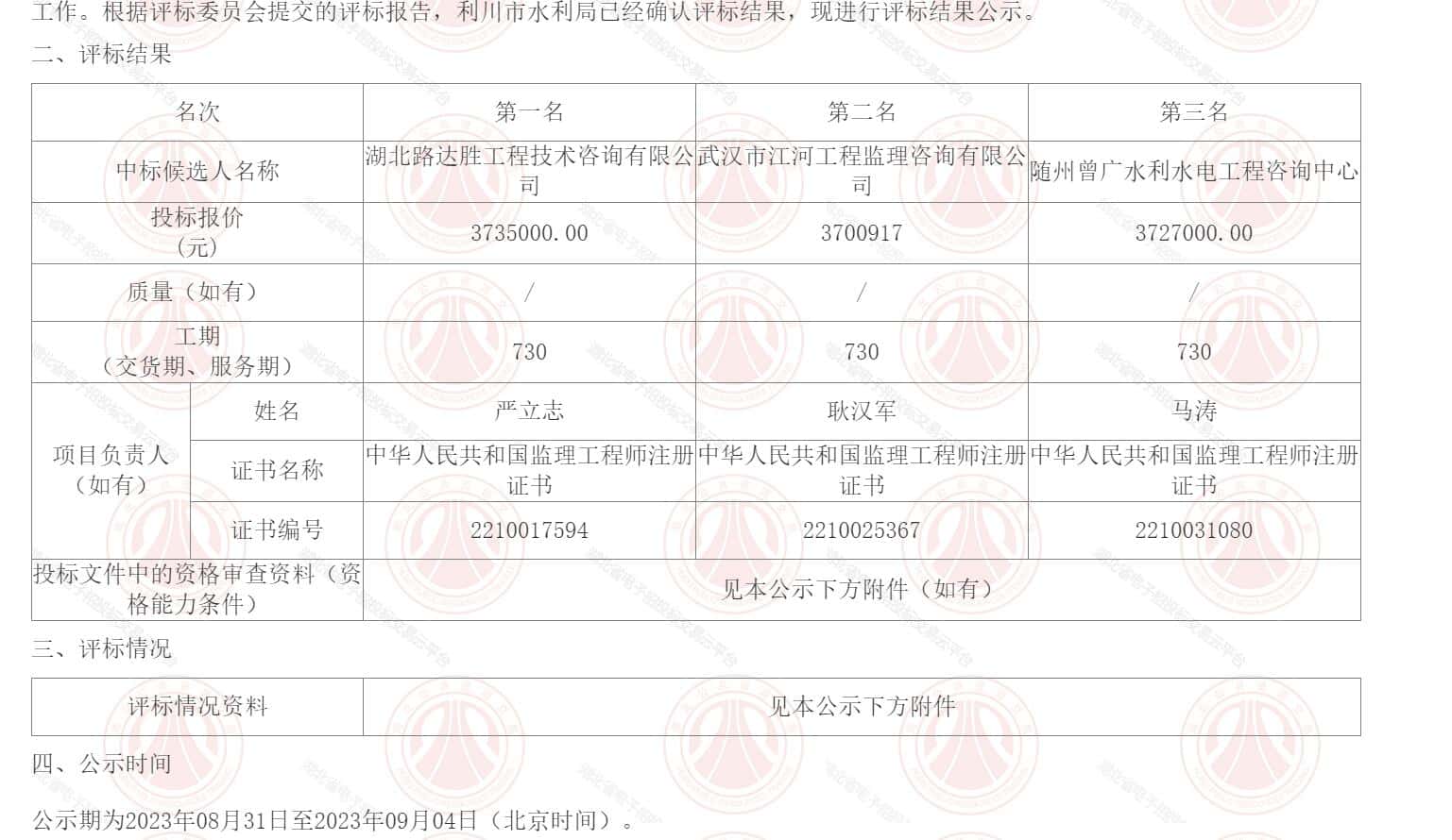 | 中标候选人名称 | 湖北路达胜工程技术咨询有限公司 | 武汉市江河工程监理咨询有限公司 | 随州曾广水利水电工程咨询中心 | ||||