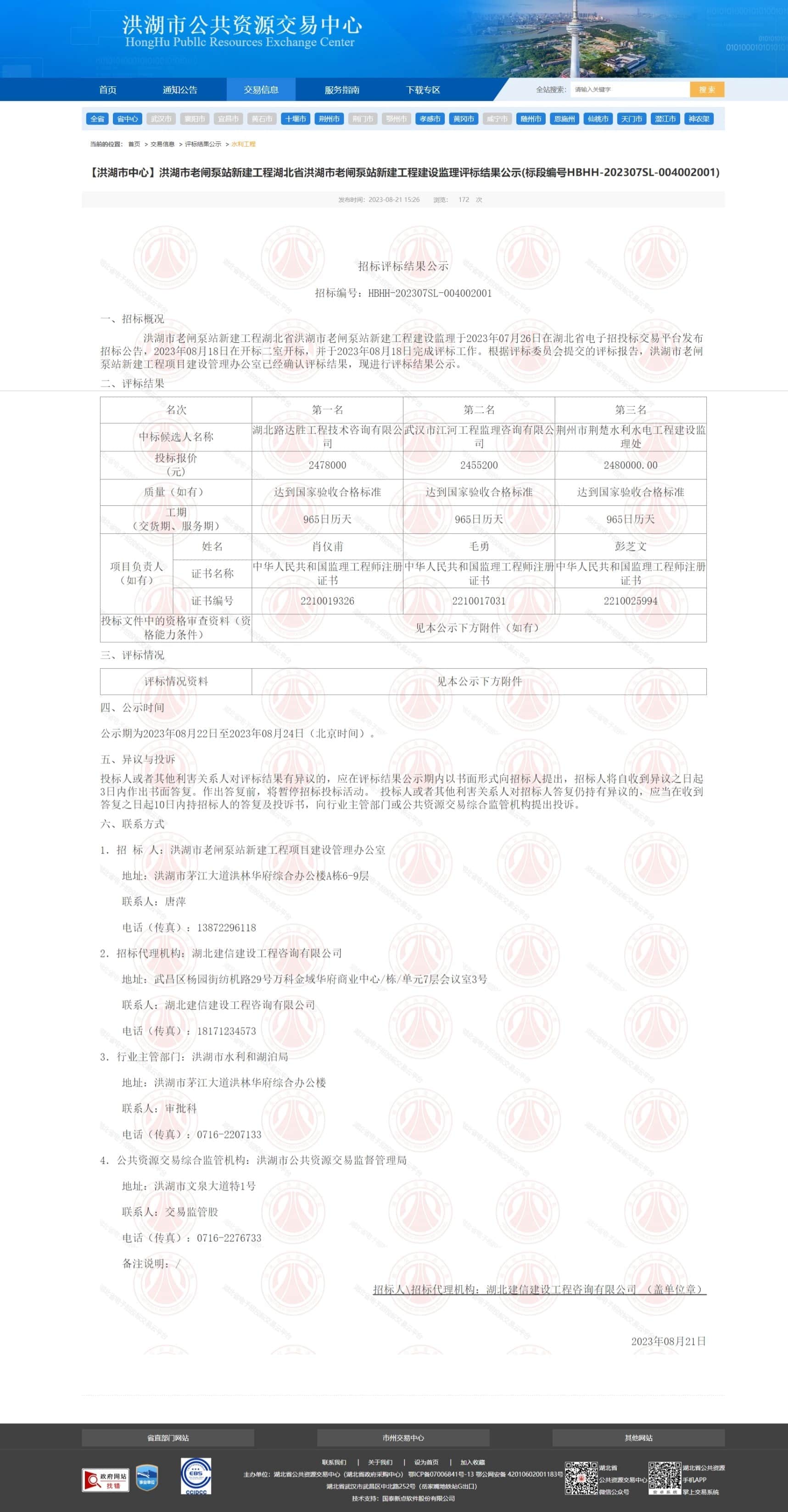 【洪湖市中心】洪湖市老闸泵站新建工程湖北省洪湖市老闸泵站新建工程建设监理评标结果公示(标段编号HBHH-202307SL-004002001)
