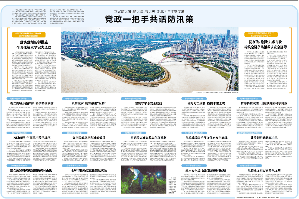 省委、省政府坚决贯彻落实习近平总书记关于防汛抗旱工作的重要讲话和指示批示精神,统筹发展和安全、防汛和抗旱,以流域综合治理明确并守住水安全底线,持续推进治水兴水大业,谱写幸福河湖荆楚篇章。各地围绕“江河不溃堤、湖库不溃坝、城市不‘看海’、人民生命安全不受损失”目标,切实落实以行政首长负责制为核心的防汛抗旱各项责任制,按照“党政同责、一岗双责、齐抓共管、失职追责”的总要求,以“时时放心不下”的责任感抓好防汛抗旱工作,坚决守牢水安全、水环境安全底线,确保人民群众生命财产安全。