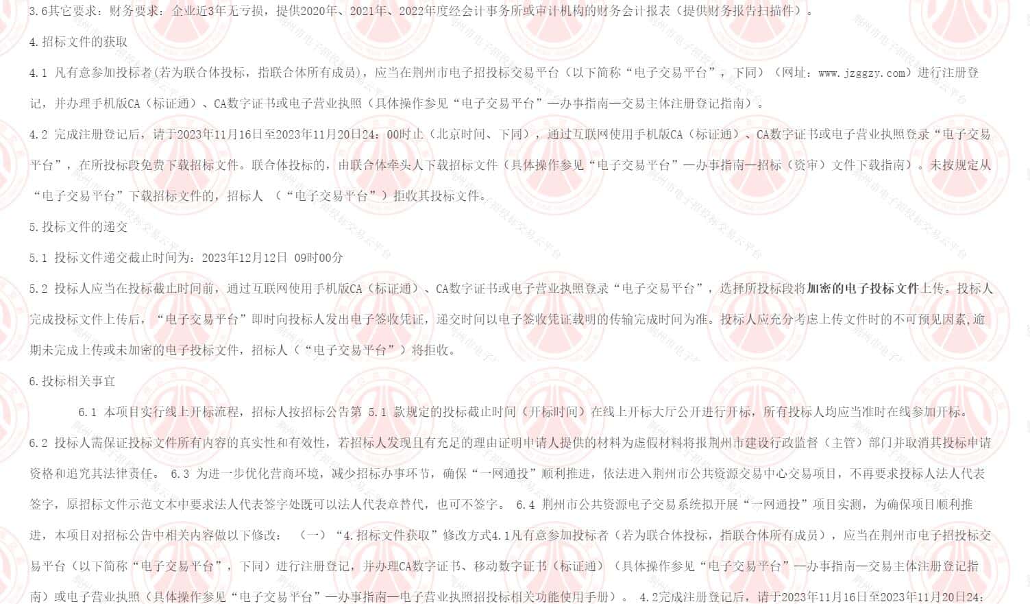 6.4 荆州市公共资源电子交易系统拟开展“一网通投”项目实测,为确保项目顺利推进,本项目对招标公告中相关内容做以下修改: (一)“4.招标文件获取”修改方式4.1凡有意参加投标者(若为联合体投标,指联合体所有成员),应当在荆州市电子招投标交易平台(以下简称“电子交易平台”,下同)进行注册登记,并办理CA数字证书、移动数字证书(标证通)(具体操作参见“电子交易平台”—办事指南—交易主体注册登记指南)或电子营业执照(具体操作参见“电子交易平台”—办事指南—电子营业执照招投标相关功能使用手册)。 4.2完成注册登记后,请于2023年11月16日至2023年11月20日24:00时止(北京时间,下同),通过互联网使用CA数字证书、移动数字证书(标证通)或电子营业执照登录“电子交易平台”,在所投标段免费下载招标文件。联合体投标的,由联合体牵头人下载招标文件(具体操作参见“电子交易平台”—办事指南—招标(资审)文件下载指南)。未按规定从“电子交易平台”下载招标文件的,招标人(“电子交易平台”)拒收其投标文件。 (二)“5.投标文件的递交”修改方式5.1投标文件递交截止时间为2023年12月12 日 09时00分。5.2投标人应当在投标截止时间前,通过互联网使用CA数字证书、移动数字证书(标证通)或电子营业执照登录“电子交易平台”,选择所投标段将加密的电子投标文件上传。投标人完成投标文件上传后,“电子交易平台”即时向投标人发出电子签收凭证,递交时间以电子签收凭证载明的传输完成时间为准。投标人应充分考虑上传文件时的不可预见因素,逾期未完成上传或未加密的电子投标文件,招标人(“电子交易平台”)将拒收。
