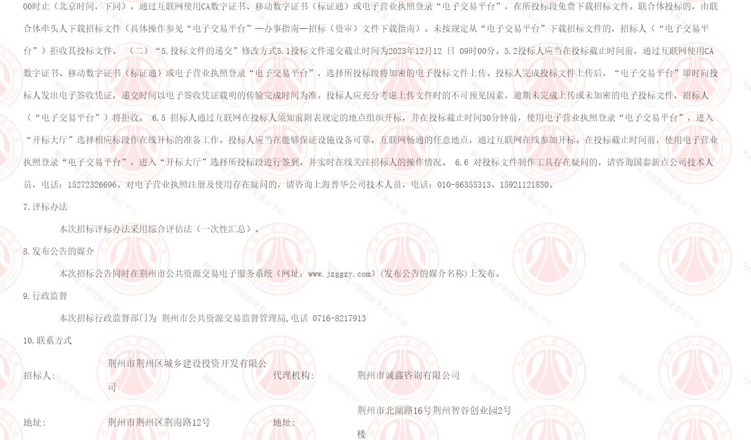 本次招标行政监督部门为 荆州市公共资源交易监督管理局,电话 0716-8217913