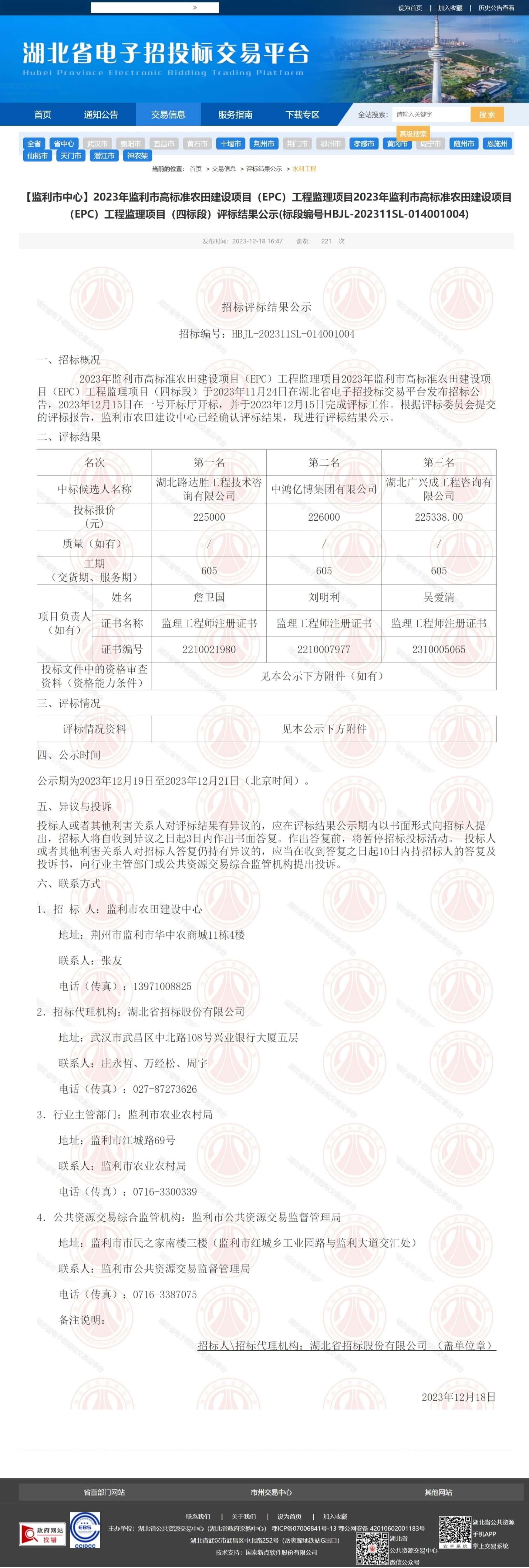 2023年监利市高标准农田建设项目(EPC)工程监理项目2023年监利市高标准农田建设项目(EPC)工程监理项目(四标段)于2023年11月24日在湖北省电子招投标交易平台发布招标公告,2023年12月15日在一号开标厅开标,并于2023年12月15日完成评标工作。根据评标委员会提交的评标报告,监利市农田建设中心已经确认评标结果,现进行评标结果公示。