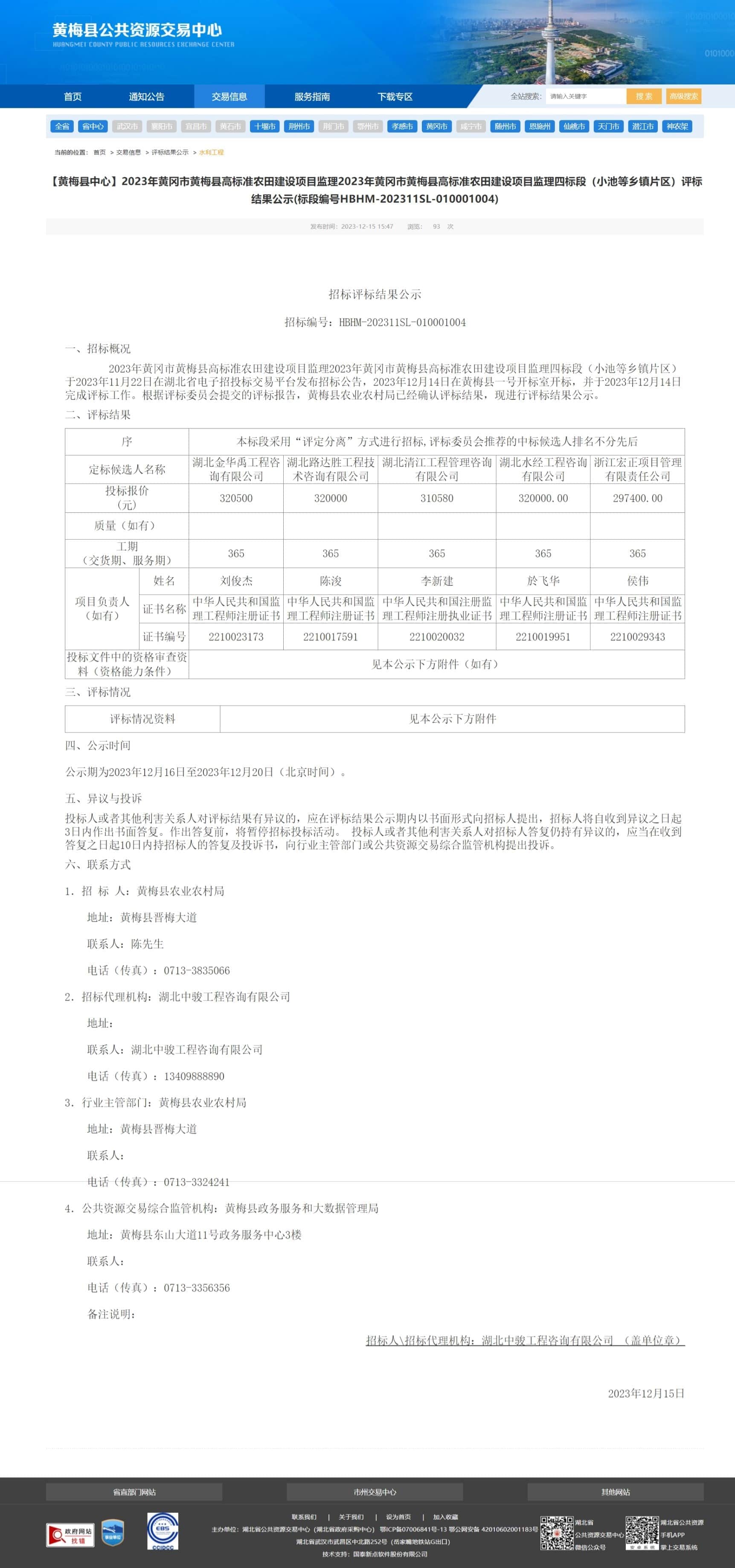 【黄梅县中心】2023年黄冈市黄梅县高标准农田建设项目监理2023年黄冈市黄梅县高标准农田建设项目监理四标段(小池等乡镇片区)评标结果公示(标段编号HBHM-202311SL-010001004)