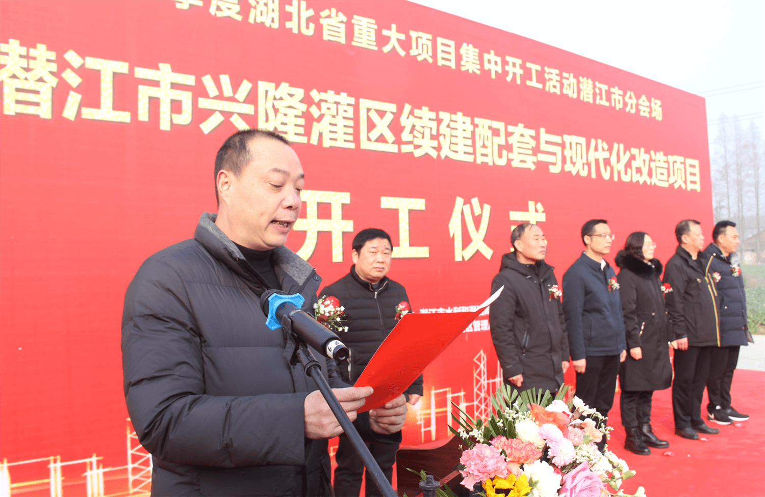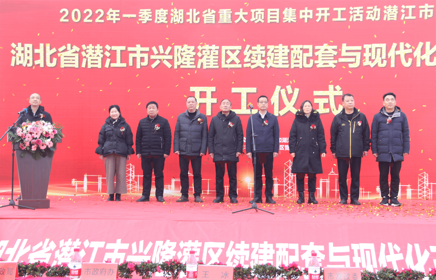 上午9时28分,开工仪式开始。潜江市水利和湖泊局党组副书记王明耀致辞;市水利和湖泊局党组成员、副局长寇强华介绍了兴隆灌区续建配套与现代化改造工程基本情况;. 市水利和湖泊局党组成员、副局长田志力主持会议。