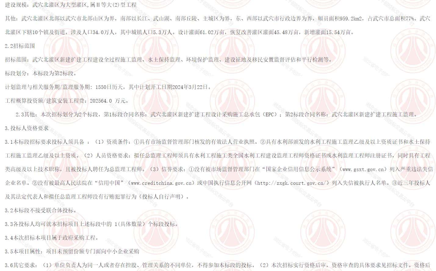 2.3其他:本次招标划分为2个标段,第1标段合同名称:武穴北灌区新建扩建工程设计采购施工总承包(EPC);第2标段合同名称:武穴北灌区新建扩建工程施工监理。