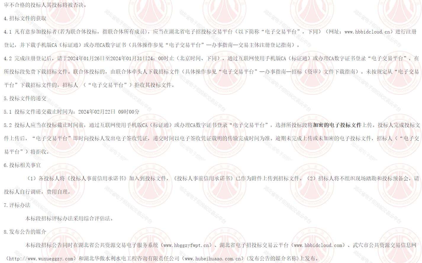 4.2 完成注册登记后,请于2024年01月26日至2024年01月31日24:00时止(北京时间、下同),通过互联网使用手机版CA(标证通)或办理CA数字证书登录“电子交易平台”,在所投标段免费下载招标文件。联合体投标的,由联合体牵头人下载招标文件(具体操作参见“电子交易平台”—办事指南—招标(资审)文件下载指南)。未按规定从“电子交易平台”下载招标文件的,招标人 (“电子交易平台”)拒收其投标文件。