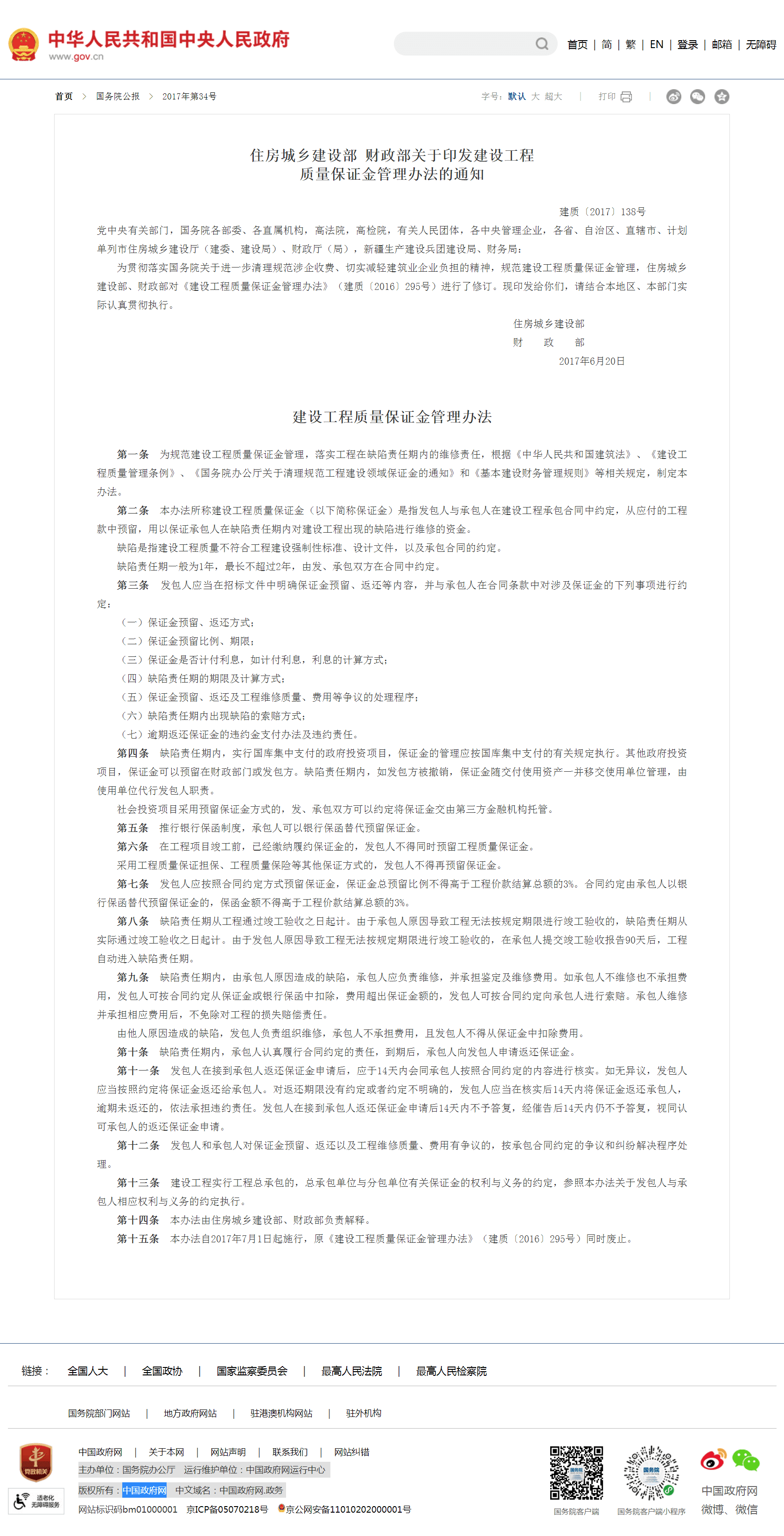 为贯彻落实国务院关于进一步清理规范涉企收费、切实减轻建筑业企业负担的精神,规范建设工程质量保证金管理,住房城乡建设部、财政部对《建设工程质量保证金管理办法》(建质〔2016〕295号)进行了修订。现印发给你们,请结合本地区、本部门实际认真贯彻执行。