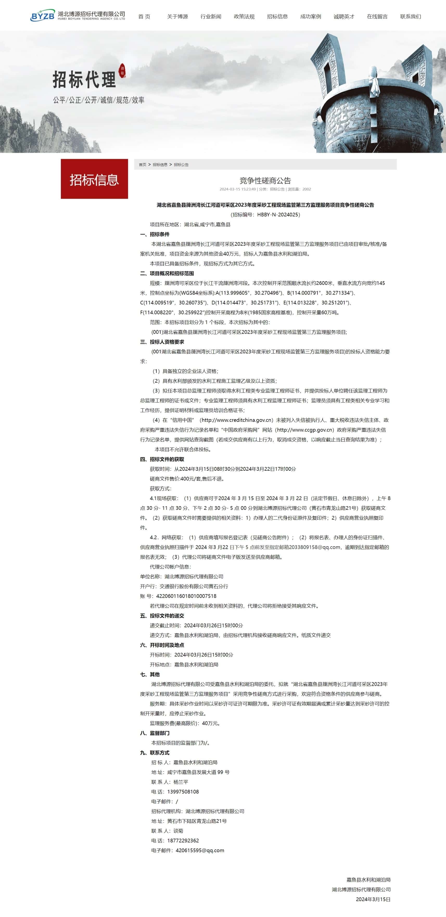 湖北博源招标代理有限公司受嘉鱼县水利和湖泊局的委托,拟就“湖北省嘉鱼县簰洲湾长江河道可采区2023年度采砂工程现场监管第三方监理服务项目”采用竞争性磋商方式进行采购,欢迎符合资格条件的供应商参与磋商。