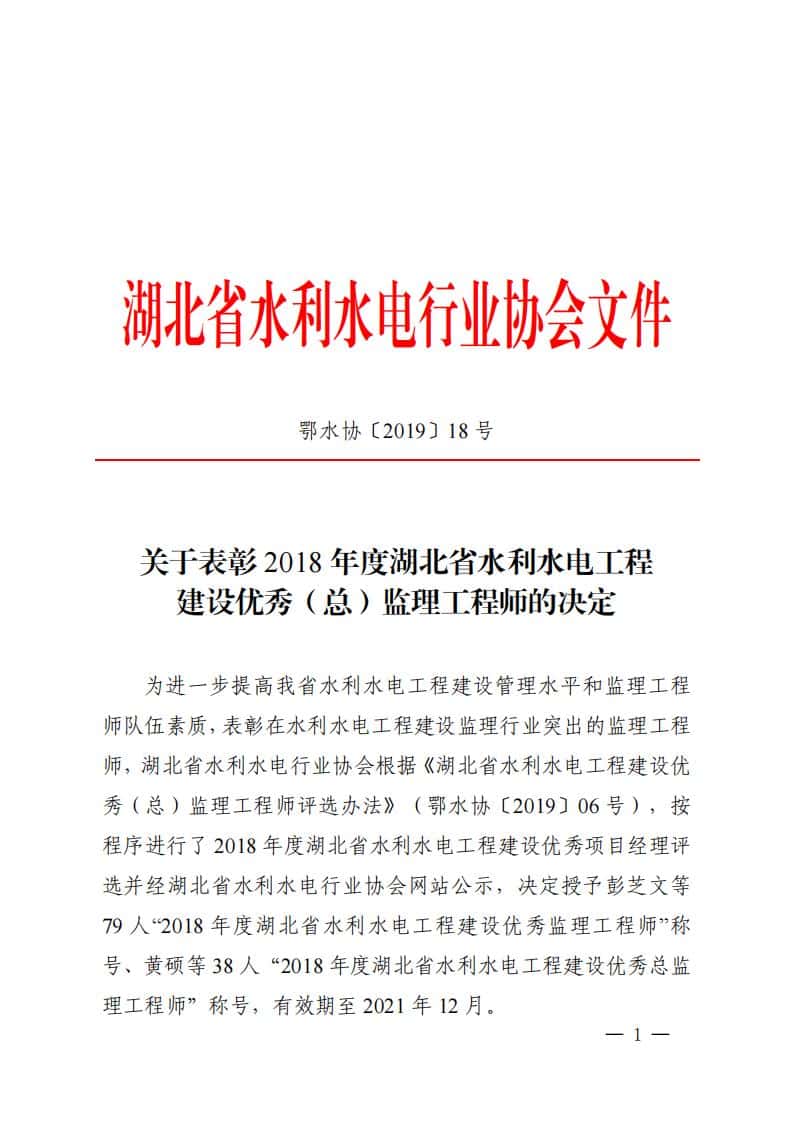 为进一步提高我省水利水电工程建设管理水平和监理工程 师队伍素质,表彰在水利水电工程建设监理行业突出的监理工程 师,湖北省水利水电行业协会根据《湖北省水利水电工程建设优 秀(总)监理工程师评选办法》(鄂水协〔2019〕06 号),按 程序进行了 2018 年度湖北省水利水电工程建设优秀项目经理评 选并经湖北省水利水电行业协会网站公示,决定授予彭芝文等 79 人“2018 年度湖北省水利水电工程建设优秀监理工程师” 称 号、黄硕等 38 人“2018 年度湖北省水利水电工程建设优秀总监理工程师”称号,有效期至 2021 年 12 月。