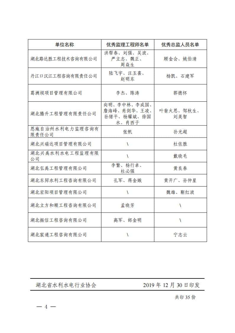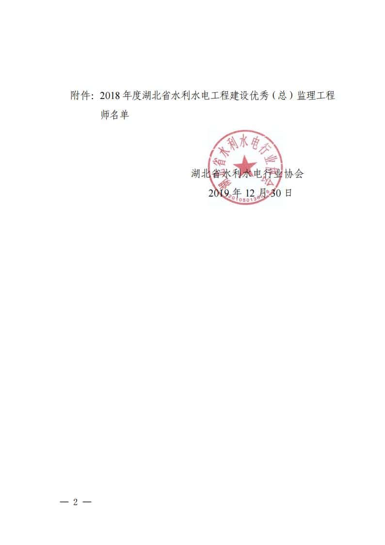 关于表彰2018年度湖北省水利水电工程建设优秀(总)监理工程师的决定