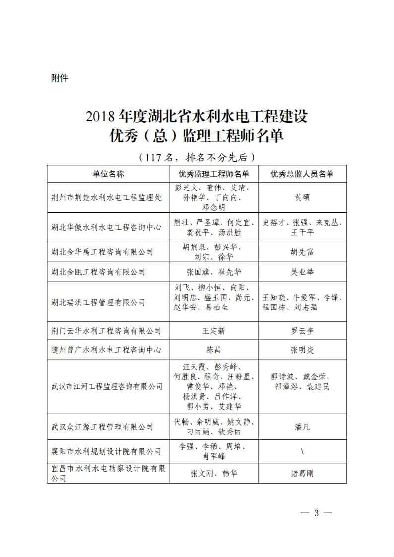 附件:2018 年度湖北省水利水电工程建设优秀(总)监理工程师名单