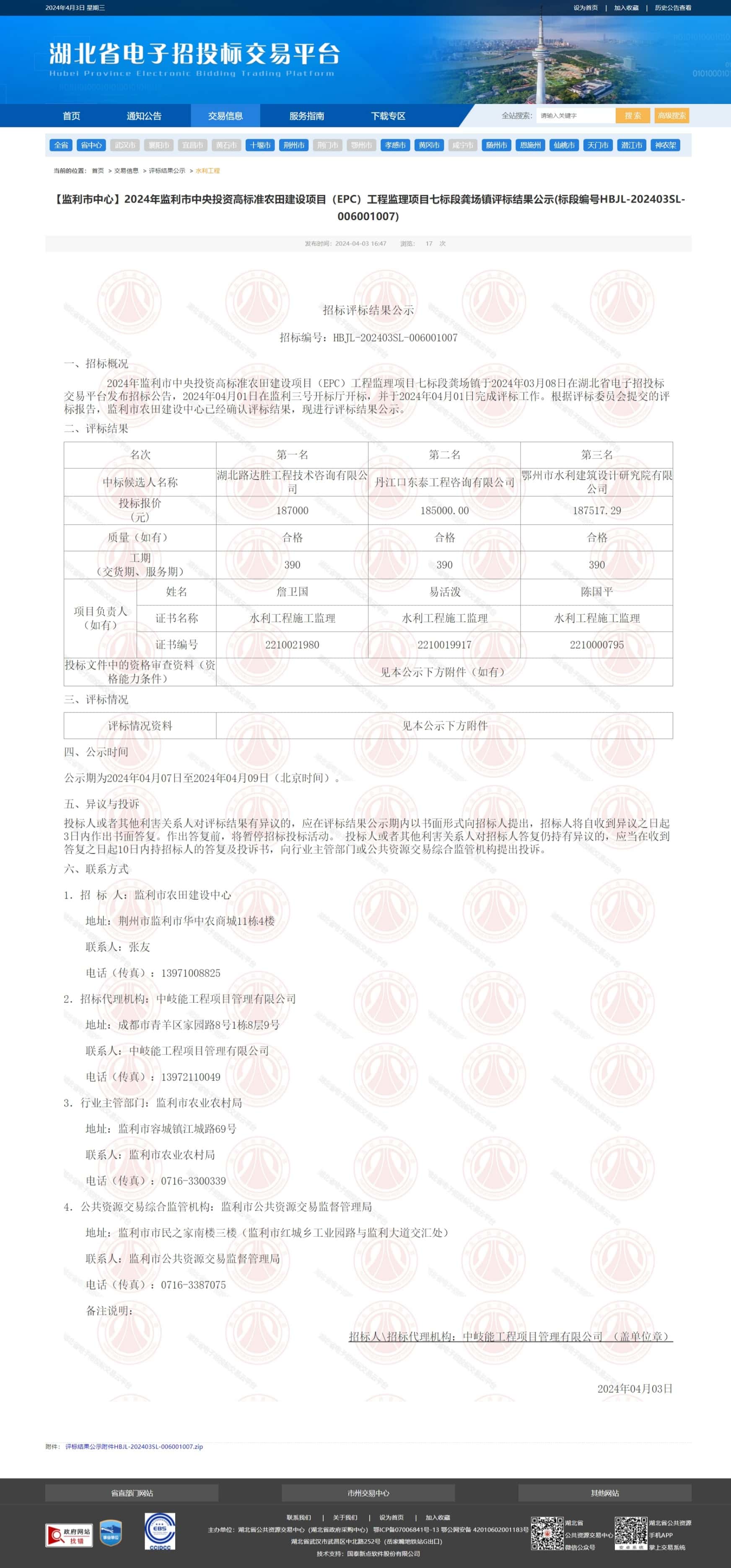 2024年监利市中央投资高标准农田建设项目(EPC)工程监理项目七标段龚场镇于2024年03月08日在湖北省电子招投标交易平台发布招标公告,2024年04月01日在监利三号开标厅开标,并于2024年04月01日完成评标工作。根据评标委员会提交的评标报告,监利市农田建设中心已经确认评标结果,现进行评标结果公示。