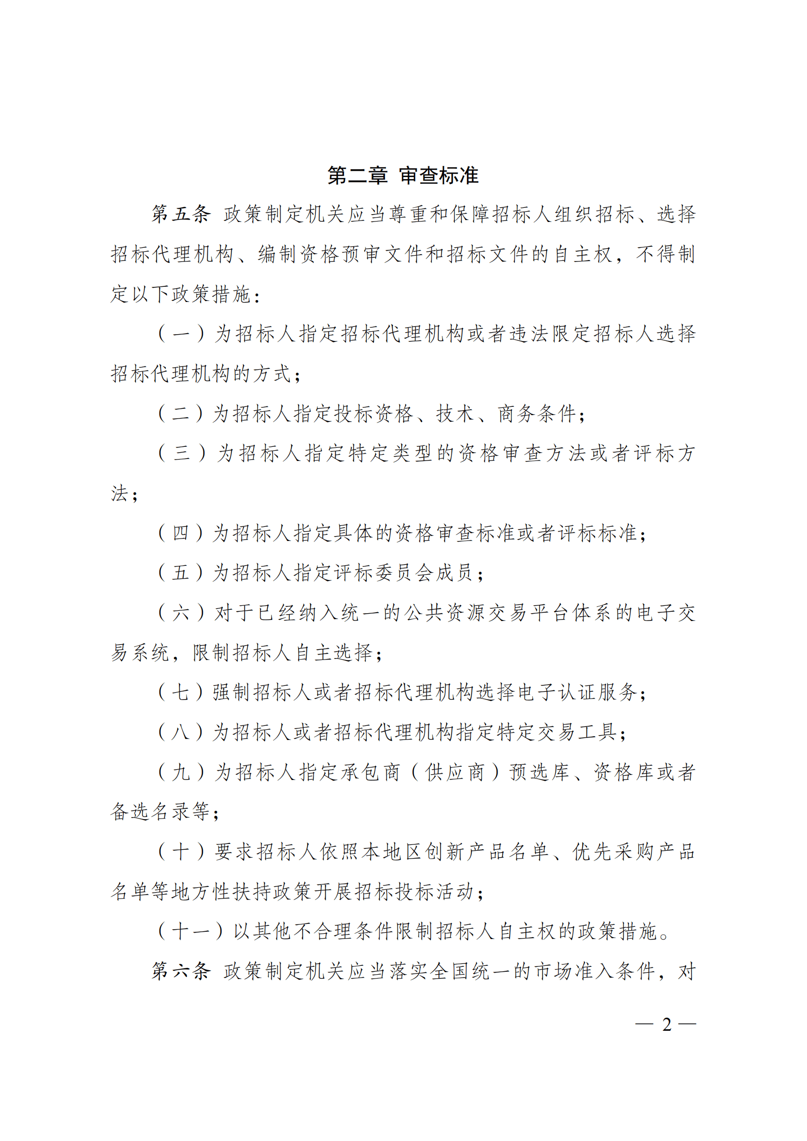 第五条 政策制定机关应当尊重和保障招标人组织招标、选择招标代理机构、编制资格预审文件和招标文件的自主权,不得制定以下政策措施: