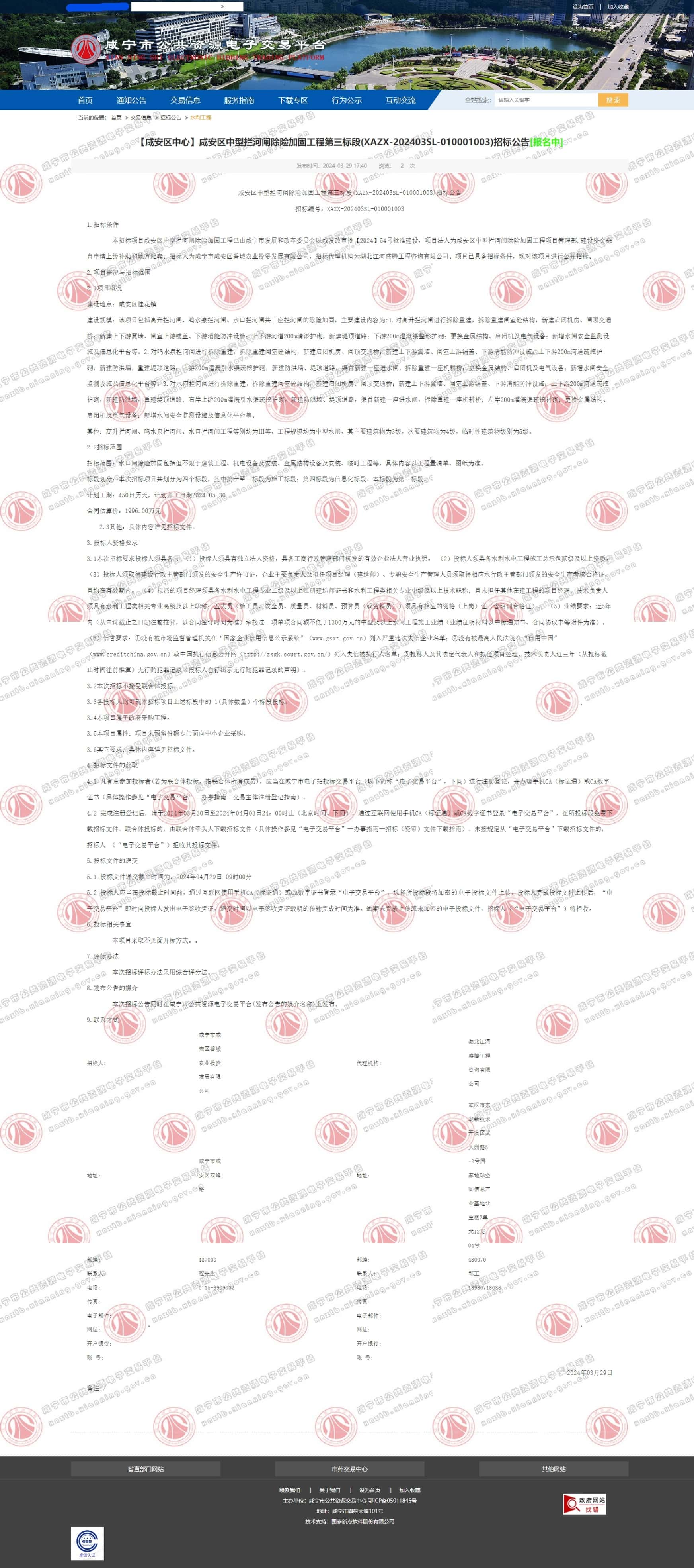 | 本招标项目咸安区中型拦河闸除险加固工程已由咸宁市发展和改革委员会以咸发改审批【2024】54号批准建设,项目法人为咸安区中型拦河闸除险加固工程项目管理部,建设资金来自申请上级补助和地方配套。招标人为咸安区中型拦河闸除险加固工程项目管理部,招标代理机构为湖北江河盛腾工程咨询有限公司。项目已具备招标条件,现对该项目进行公开招标。 | |||||||||||||||||||||||||||||||||||||||||