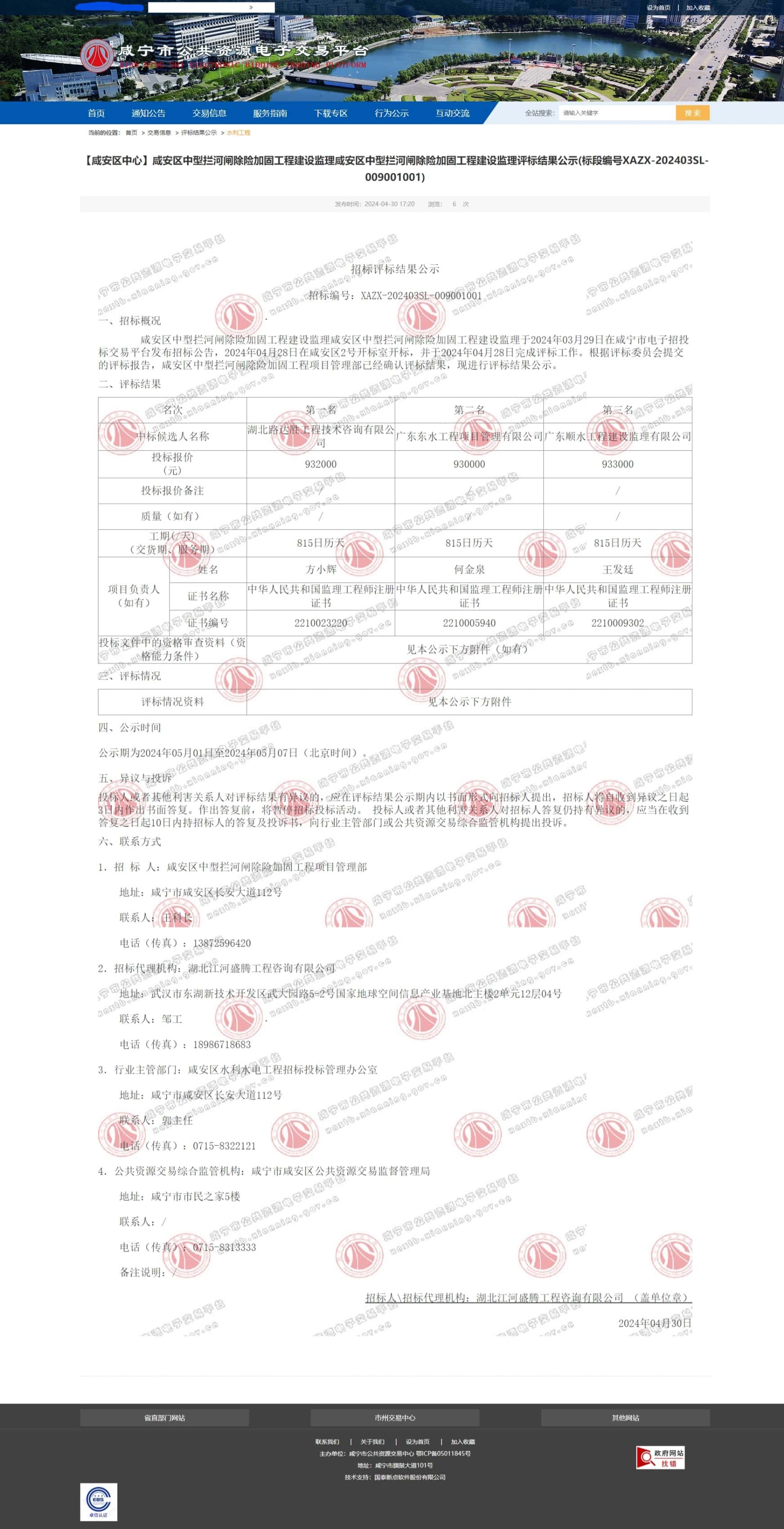咸安区中型拦河闸除险加固工程建设监理咸安区中型拦河闸除险加固工程建设监理于2024年03月29日在咸宁市电子招投标交易平台发布招标公告,2024年04月28日在咸安区2号开标室开标,并于2024年04月28日完成评标工作。根据评标委员会提交的评标报告,咸安区中型拦河闸除险加固工程项目管理部已经确认评标结果,现进行评标结果公示。