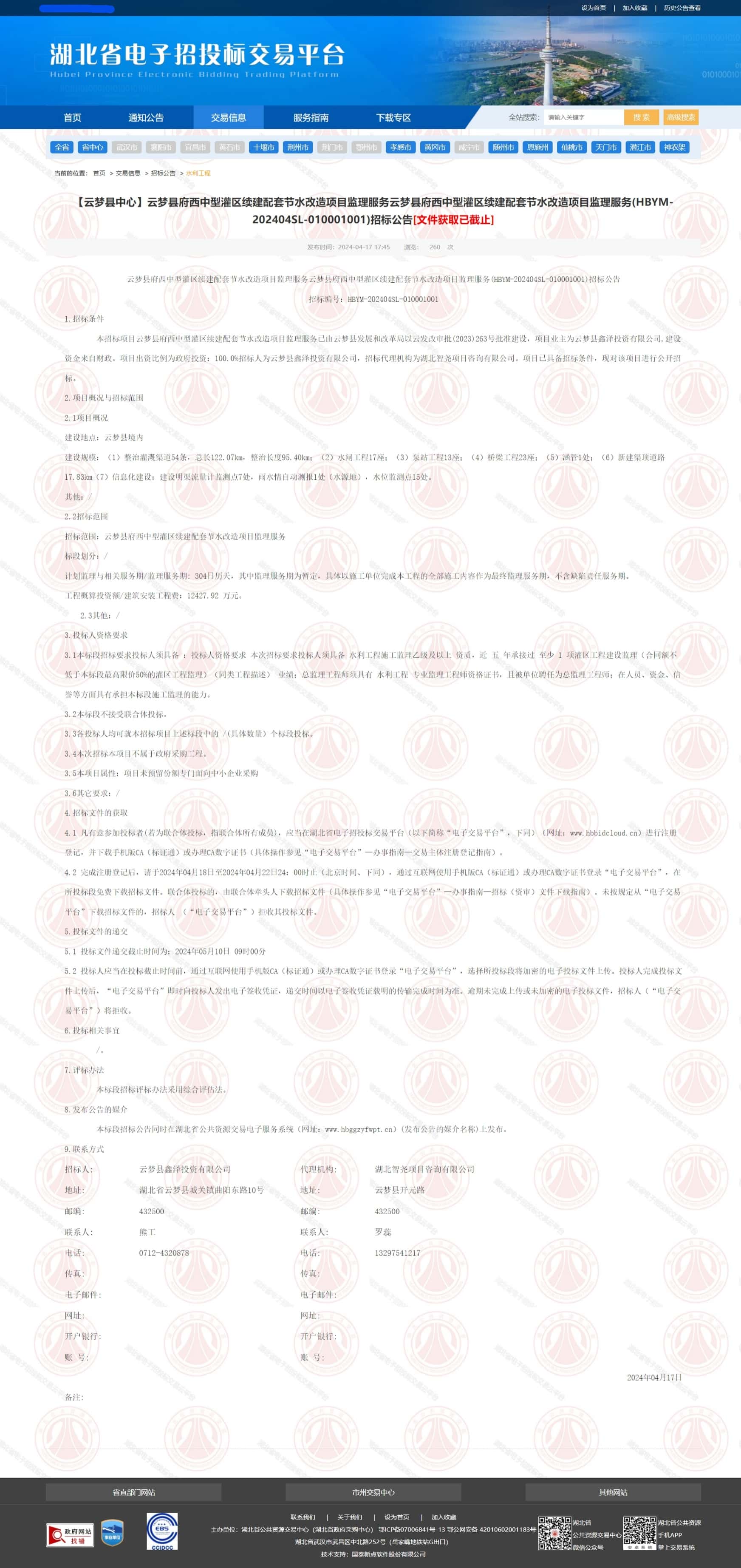 | 本招标项目云梦县府西中型灌区续建配套节水改造项目监理服务已由云梦县发展和改革局以云发改审批(2023)263号批准建设,项目业主为云梦县鑫泽投资有限公司,建设资金来自财政。项目出资比例为政府投资:100.0%招标人为云梦县鑫泽投资有限公司,招标代理机构为湖北智尧项目咨询有限公司。项目已具备招标条件,现对该项目进行公开招标。 | |||||||||||||||||||||||||||||||||||||||||