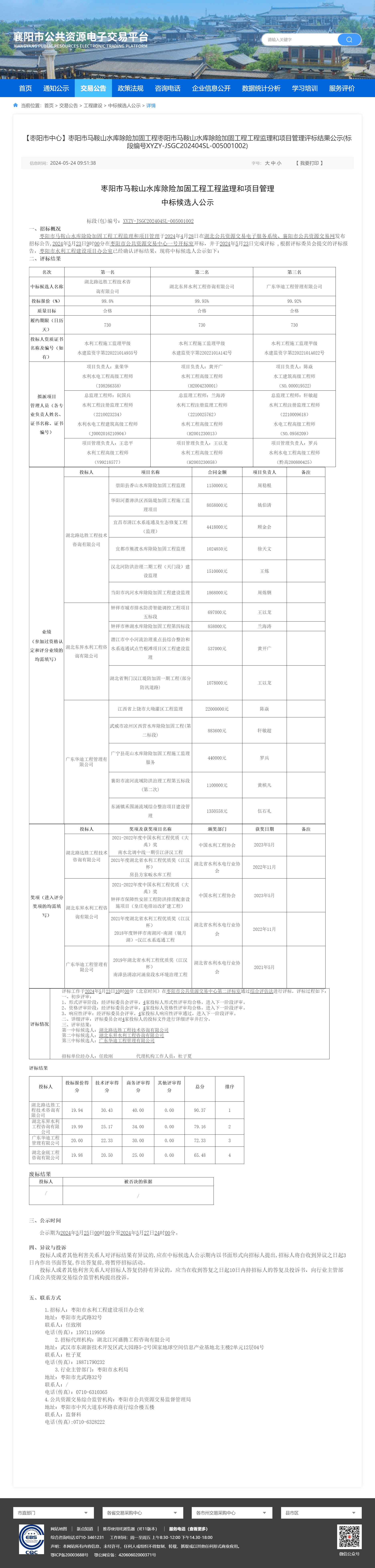 枣阳市马鞍山水库除险加固工程工程监理和项目管理2024428日在湖北公共资源交易电子服务系统、襄阳市公共资源交易网发布招标公告,2024523900分在枣阳市公共资源交易中心一号开标室开标,并于2024523日完成评标 ,根据评标委员会提交的评标报告,枣阳市水利工程建设项目办公室已经确认评标结果,现将中标候选人公示如下: