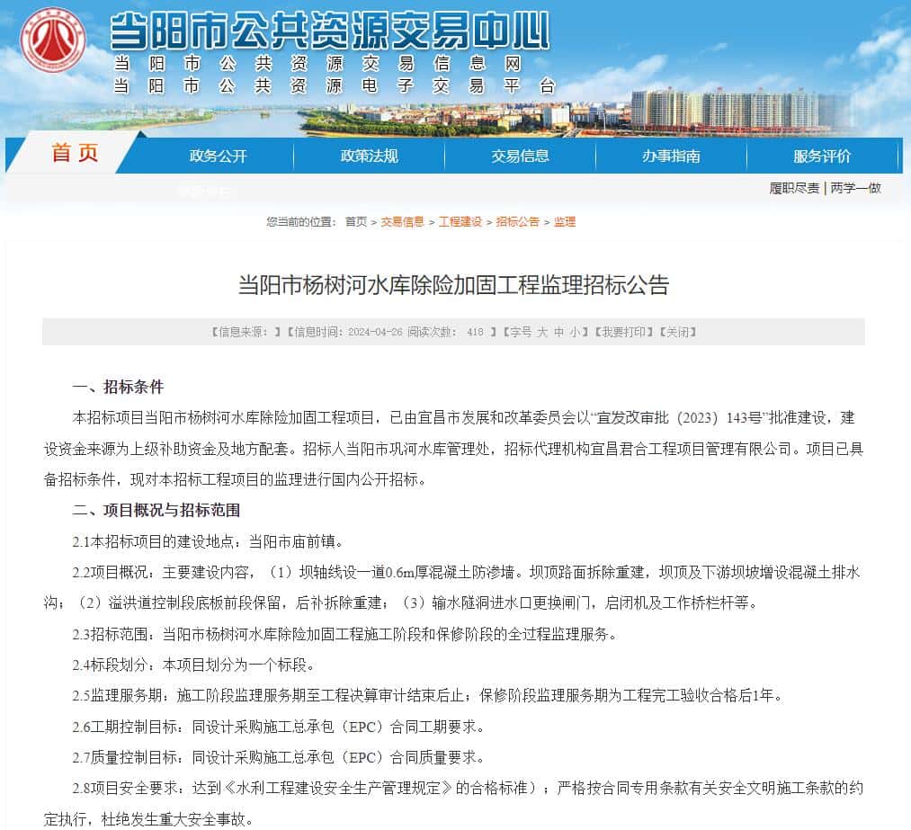 本招标项目当阳市杨树河水库除险加固工程项目,已由宜昌市发展和改革委员会以“宜发改审批(2023)143号”批准建设,建设资金来源为上级补助资金及地方配套。招标人当阳市巩河水库管理处,招标代理机构宜昌君合工程项目管理有限公司。项目已具备招标条件,现对本招标工程项目的监理进行国内公开招标。