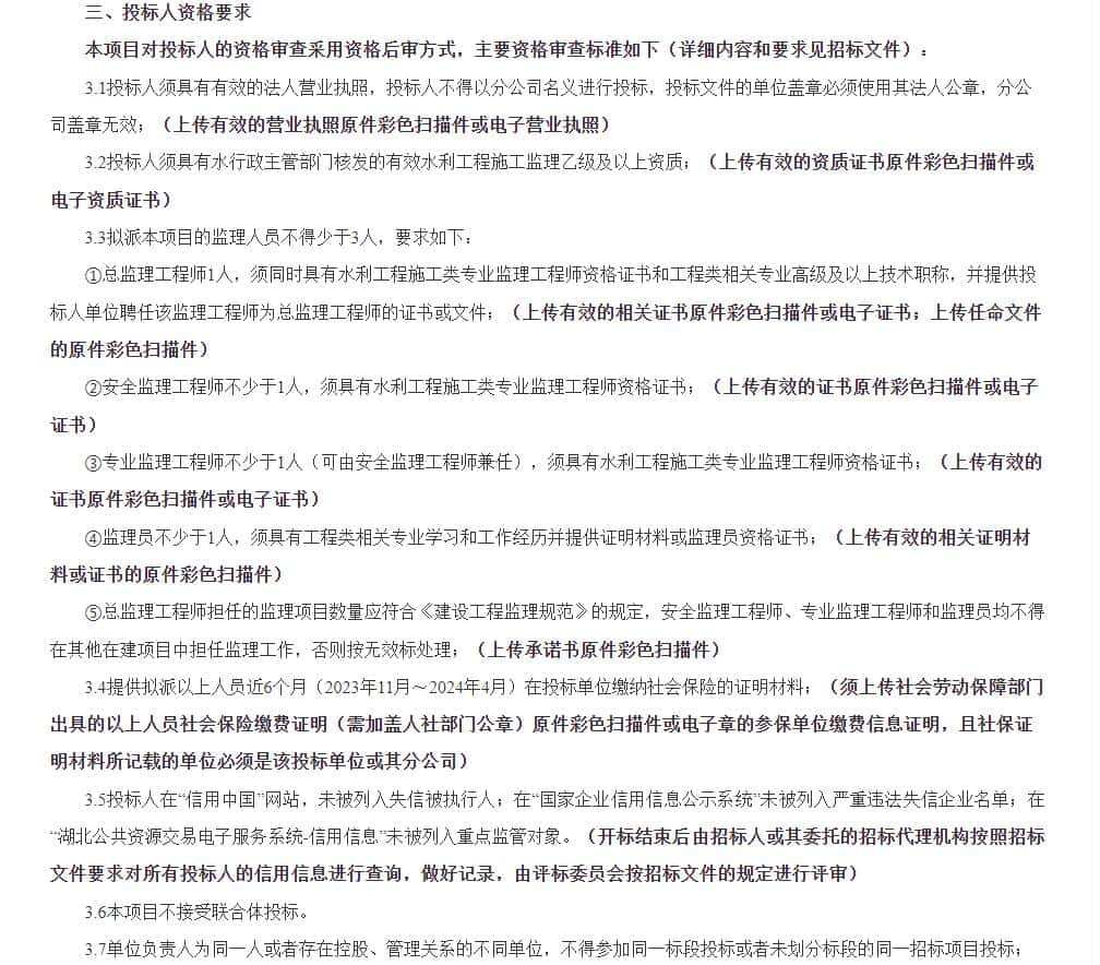 3.2投标人须具有水行政主管部门核发的有效水利工程施工监理乙级及以上资质;(上传有效的资质证书原件彩色扫描件或电子资质证书)