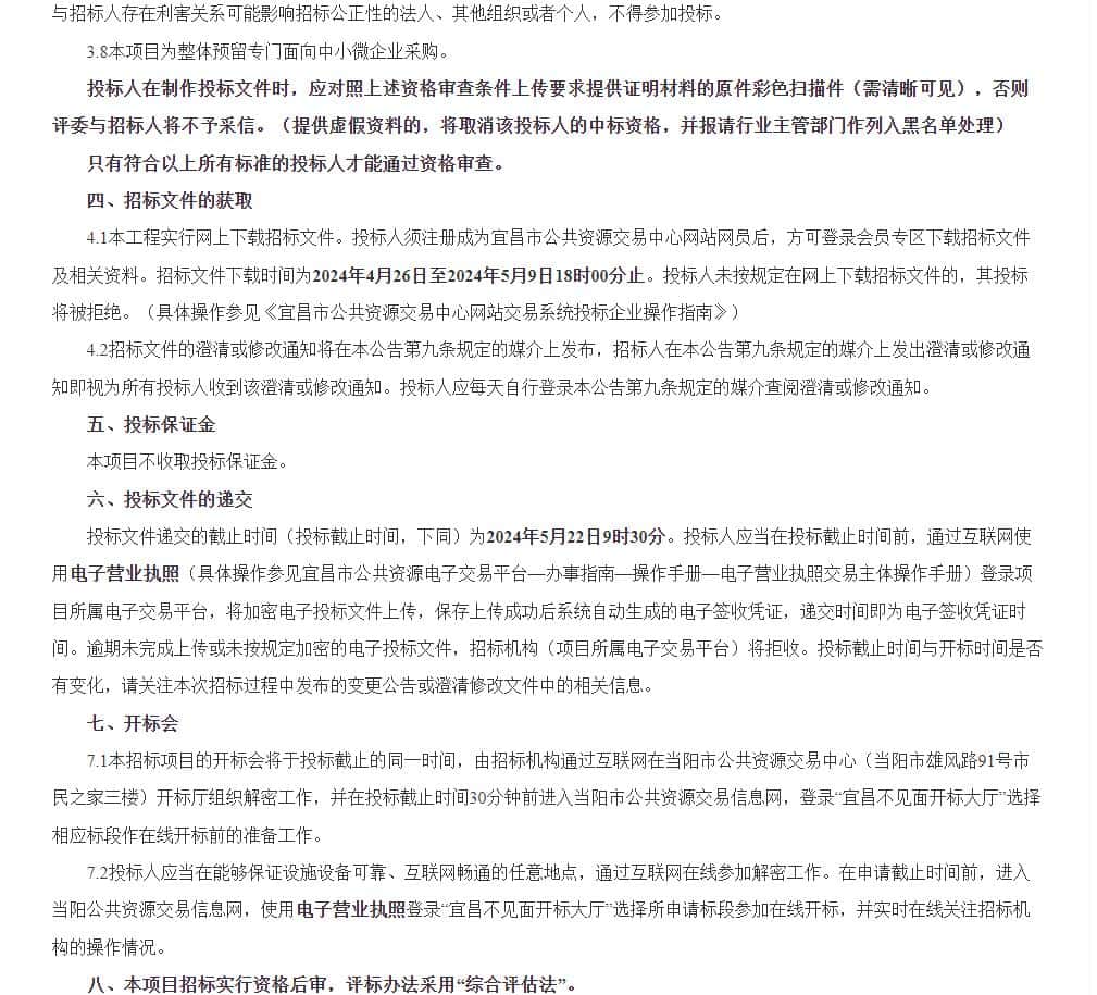 投标文件递交的截止时间(投标截止时间,下同)为2024年5月22日9时30分。投标人应当在投标截止时间前,通过互联网使用电子营业执照(具体操作参见宜昌市公共资源电子交易平台—办事指南—操作手册—电子营业执照交易主体操作手册)登录项目所属电子交易平台,将加密电子投标文件上传,保存上传成功后系统自动生成的电子签收凭证,递交时间即为电子签收凭证时间。逾期未完成上传或未按规定加密的电子投标文件,招标机构(项目所属电子交易平台)将拒收。投标截止时间与开标时间是否有变化,请关注本次招标过程中发布的变更公告或澄清修改文件中的相关信息。