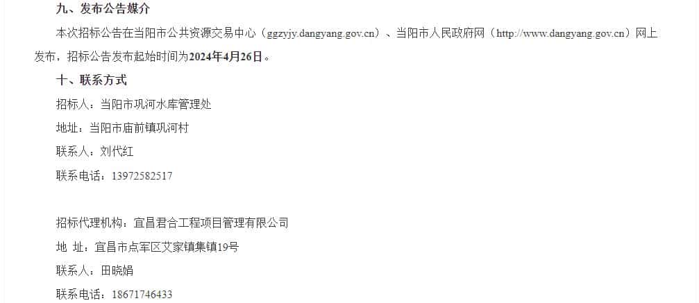 本次招标公告在当阳市公共资源交易中心(ggzyjy.dangyang.gov.cn)、当阳市人民政府网(http://www.dangyang.gov.cn)网上发布,招标公告发布起始时间为2024年4月26日。