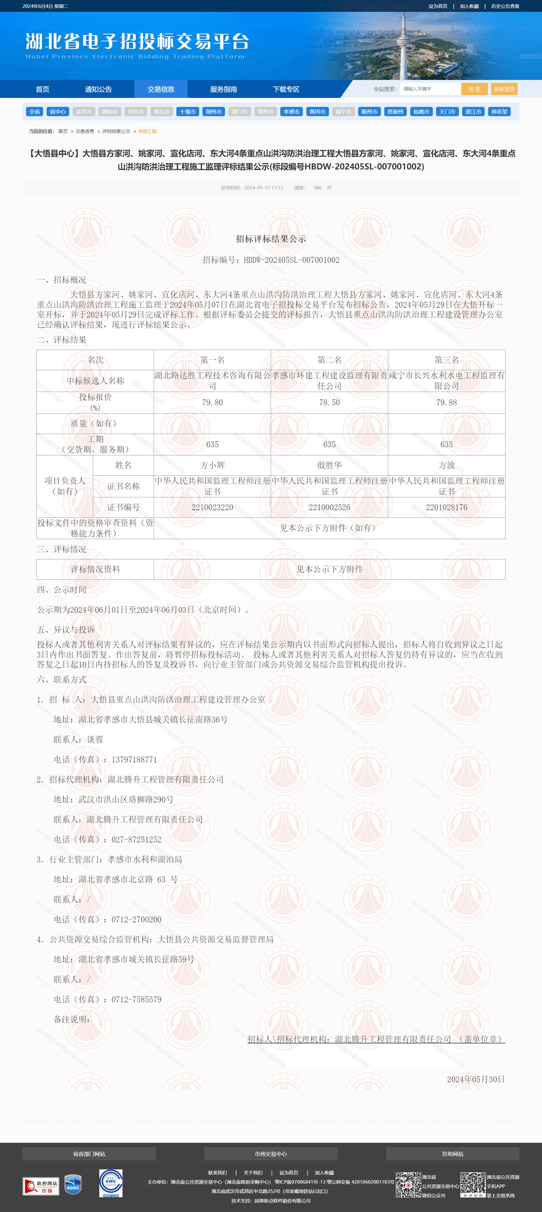 大悟县方家河、姚家河、宣化店河、东大河4条重点山洪沟防洪治理工程大悟县方家河、姚家河、宣化店河、东大河4条重点山洪沟防洪治理工程施工监理于2024年05月07日在湖北省电子招投标交易平台发布招标公告,2024年05月29日在大悟开标一室开标,并于2024年05月29日完成评标工作。根据评标委员会提交的评标报告,大悟县重点山洪沟防洪治理工程建设管理办公室已经确认评标结果,现进行评标结果公示。