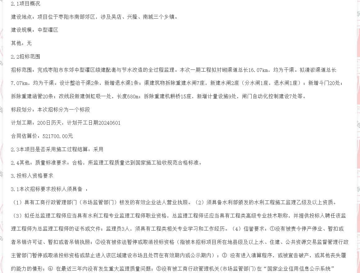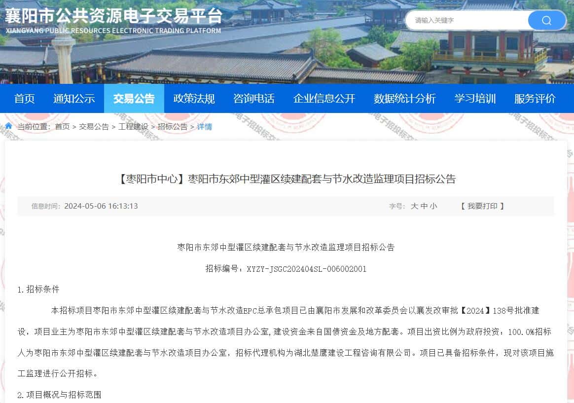 枣阳市东郊中型灌区续建配套与节水改造监理项目招标公告