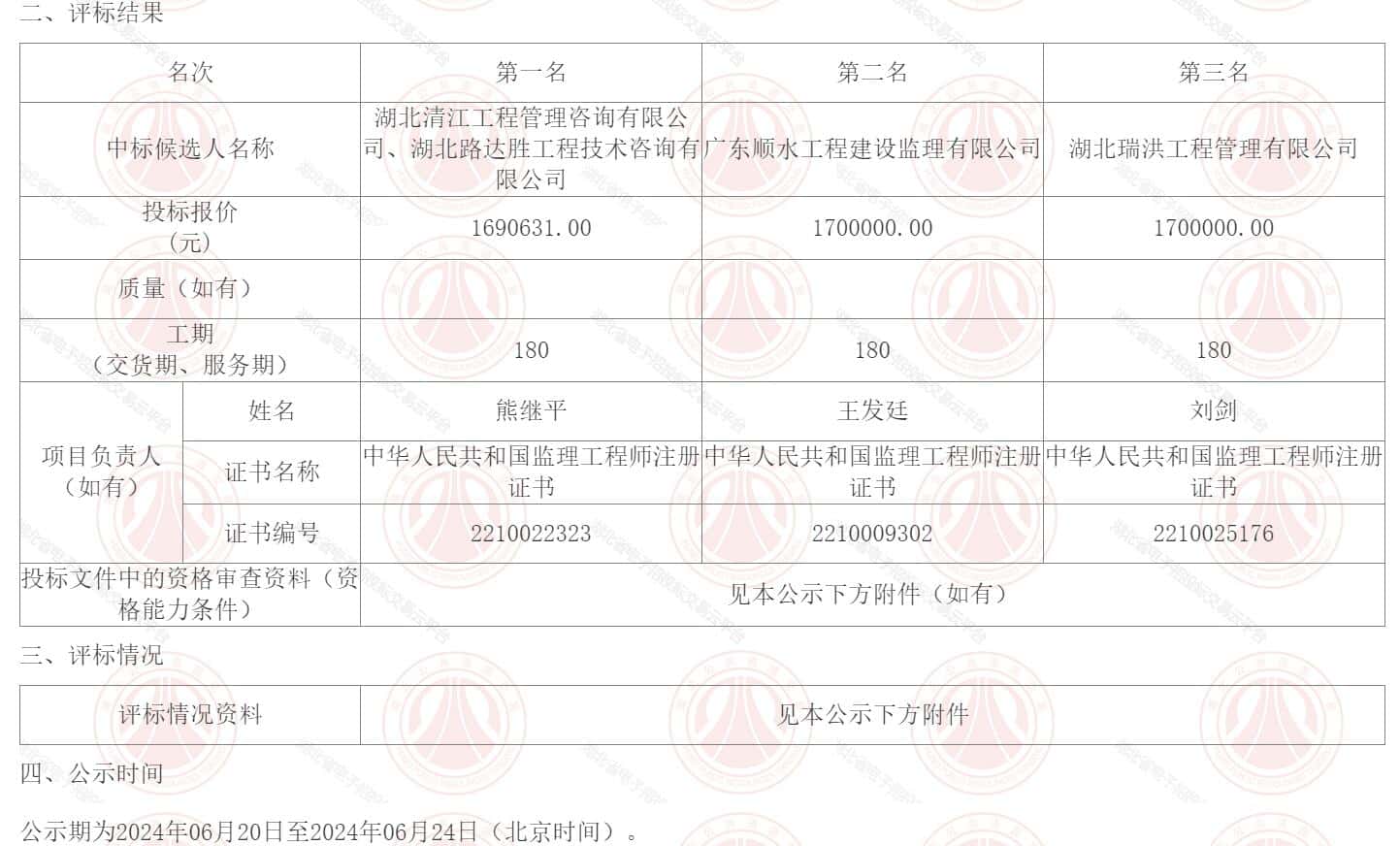 中标候选人名称 湖北清江工程管理咨询有限公司、湖北路达胜工程技术咨询有限公司 广东顺水工程建设监理有限公司 湖北瑞洪工程管理有限公司