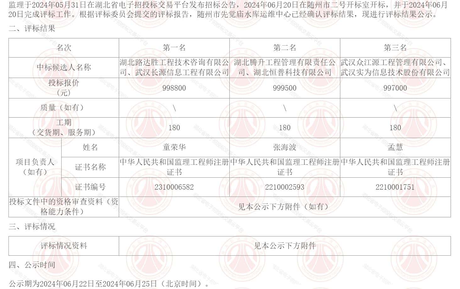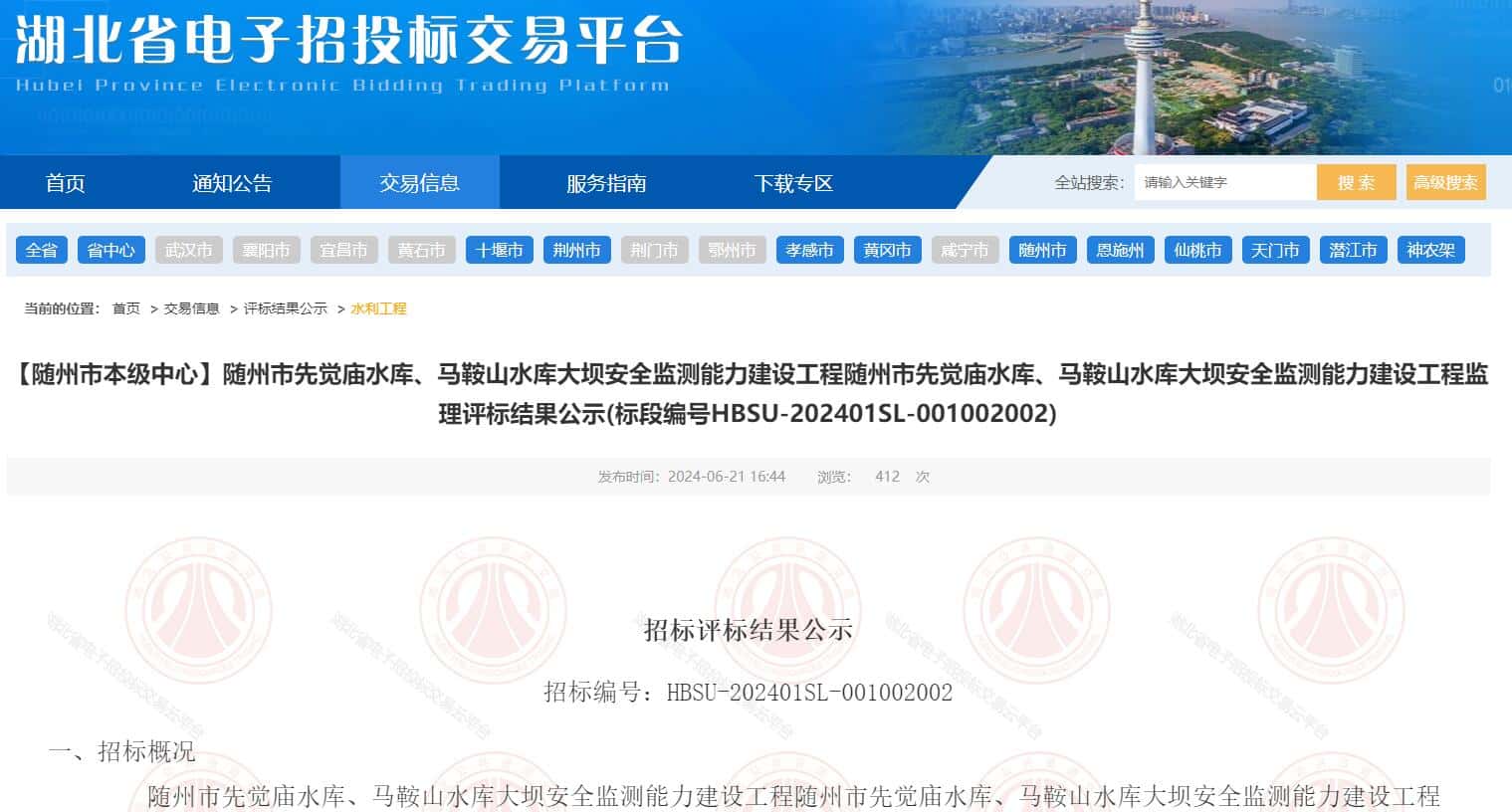 随州市先觉庙水库、马鞍山水库大坝安全监测能力建设工程随州市先觉庙水库、马鞍山水库大坝安全监测能力建设工程监理于2024年05月31日在湖北省电子招投标交易平台发布招标公告,2024年06月20日在随州市二号开标室开标,并于2024年06月20日完成评标工作。根据评标委员会提交的评标报告,随州市先觉庙水库运维中心已经确认评标结果,现进行评标结果公示。