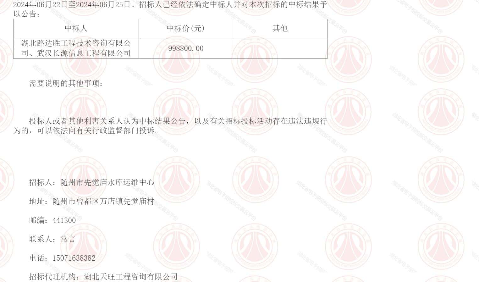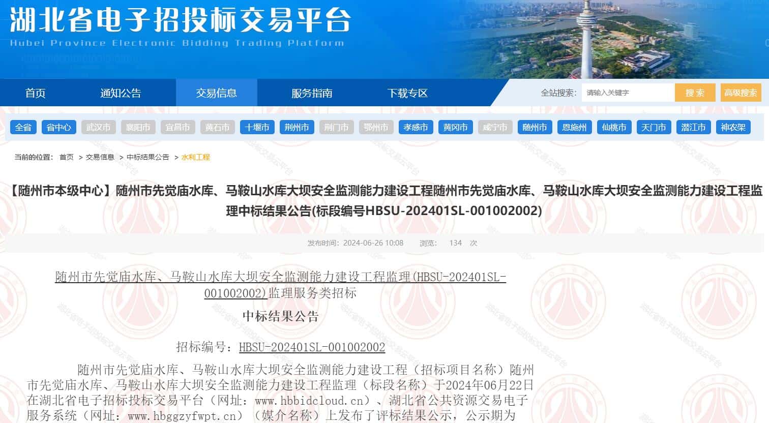 随州市先觉庙水库、马鞍山水库大坝安全监测能力建设工程(招标项目名称)随州市先觉庙水库、马鞍山水库大坝安全监测能力建设工程监理(标段名称)于2024年06月22日在湖北省电子招标投标交易平台(网址:www.hbbidcloud.cn)、湖北省公共资源交易电子服务系统(网址:www.hbggzyfwpt.cn)(媒介名称)上发布了评标结果公示,公示期为2024年06月22日至2024年06月25日。招标人已经依法确定中标人并对本次招标的中标结果予以公告: