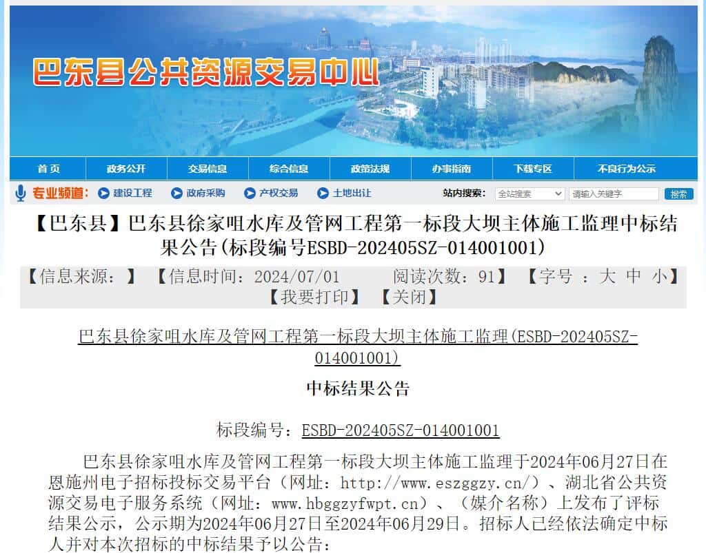 巴东县徐家咀水库及管网工程第一标段大坝主体施工监理于2024年06月27日在恩施州电子招标投标交易平台(网址:http://www.eszggzy.cn/)、湖北省公共资源交易电子服务系统(网址:www.hbggzyfwpt.cn)、(媒介名称)上发布了评标结果公示,公示期为2024年06月27日至2024年06月29日。招标人已经依法确定中标人并对本次招标的中标结果予以公告: