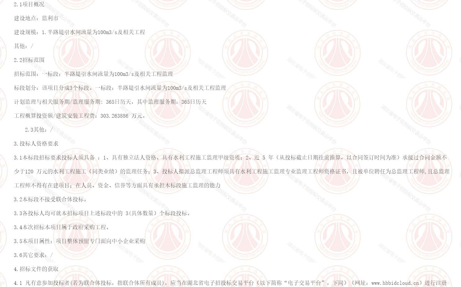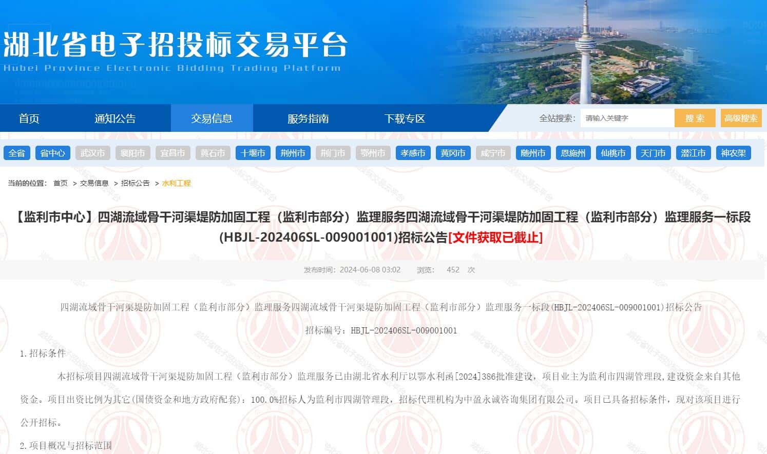 四湖流域骨干河渠堤防加固工程(监利市部分)监理服务四湖流域骨干河渠堤防加固工程(监利市部分)监理服务一标段(HBJL-202406SL-009001001)招标公告