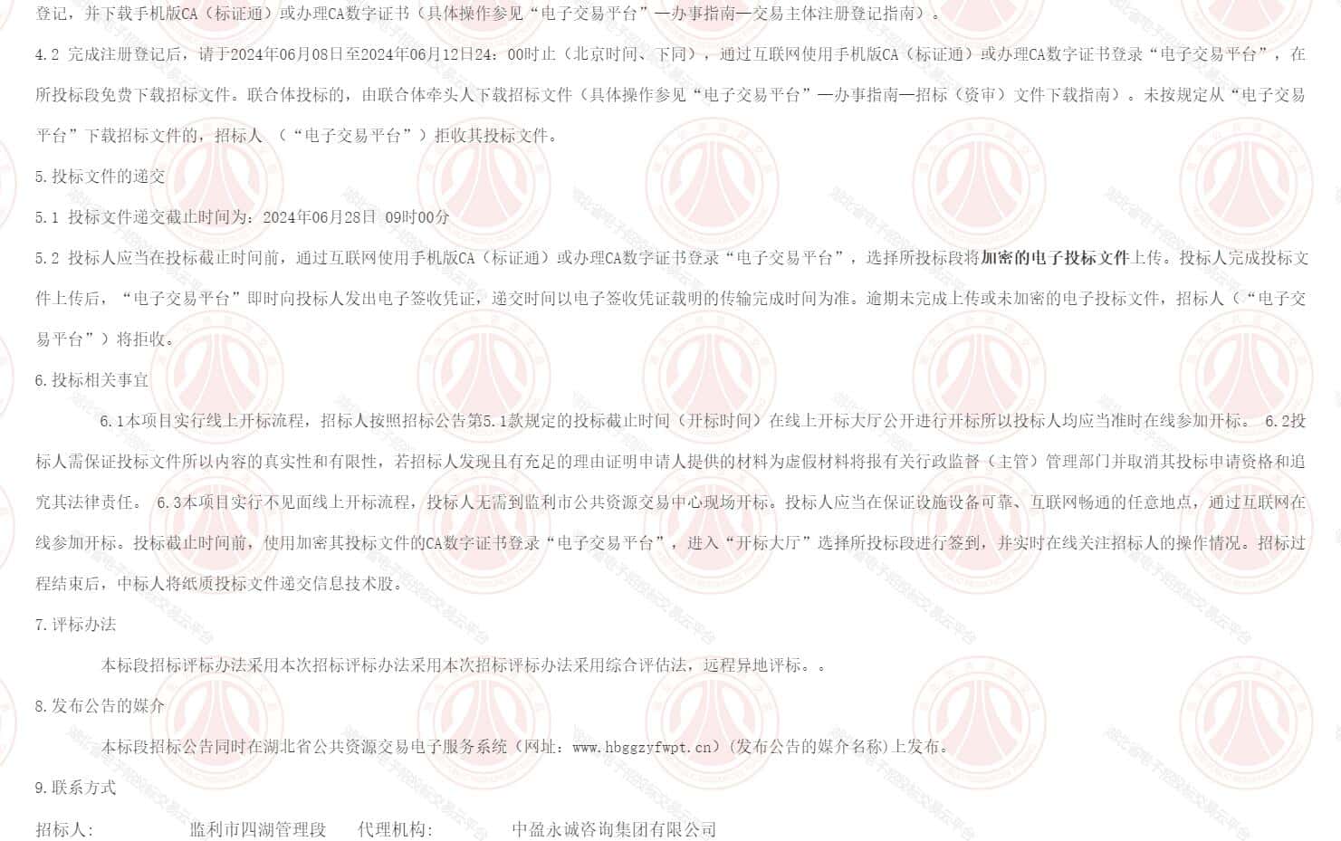 | 4.1 凡有意参加投标者(若为联合体投标,指联合体所有成员),应当在湖北省电子招投标交易平台(以下简称“电子交易平台”,下同)(网址:www.hbbidcloud.cn)进行注册登记,并下载手机版CA(标证通)或办理CA数字证书(具体操作参见“电子交易平台”—办事指南—交易主体注册登记指南)。 4.2 完成注册登记后,请于2024年06月08日至2024年06月12日24:00时止(北京时间、下同),通过互联网使用手机版CA(标证通)或办理CA数字证书登录“电子交易平台”,在所投标段免费下载招标文件。联合体投标的,由联合体牵头人下载招标文件(具体操作参见“电子交易平台”—办事指南—招标(资审)文件下载指南)。未按规定从“电子交易平台”下载招标文件的,招标人 (“电子交易平台”)拒收其投标文件。 |