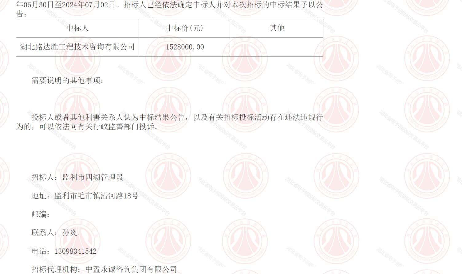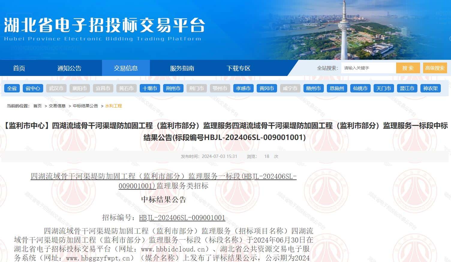 四湖流域骨干河渠堤防加固工程(监利市部分)监理服务(招标项目名称)四湖流域骨干河渠堤防加固工程(监利市部分)监理服务一标段(标段名称)于2024年06月30日在湖北省电子招标投标交易平台(网址:www.hbbidcloud.cn)、湖北省公共资源交易电子服务系统(网址:www.hbggzyfwpt.cn)(媒介名称)上发布了评标结果公示,公示期为2024年06月30日至2024年07月02日。招标人已经依法确定中标人并对本次招标的中标结果予以公告: