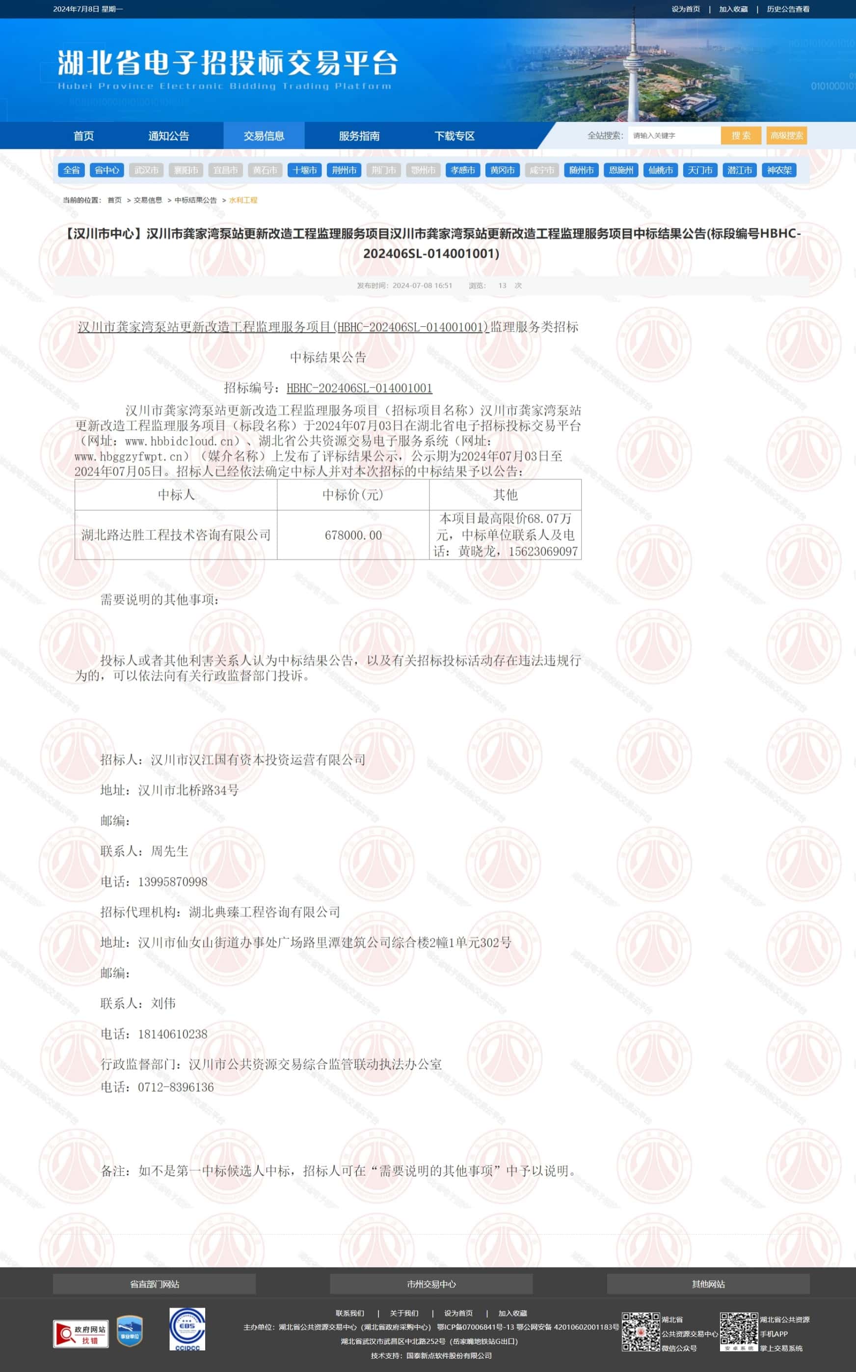 | 湖北路达胜工程技术咨询有限公司 | 678000.00 | 本项目最高限价68.07万元,中标单位联系人及电话:黄晓龙,15623069097 |