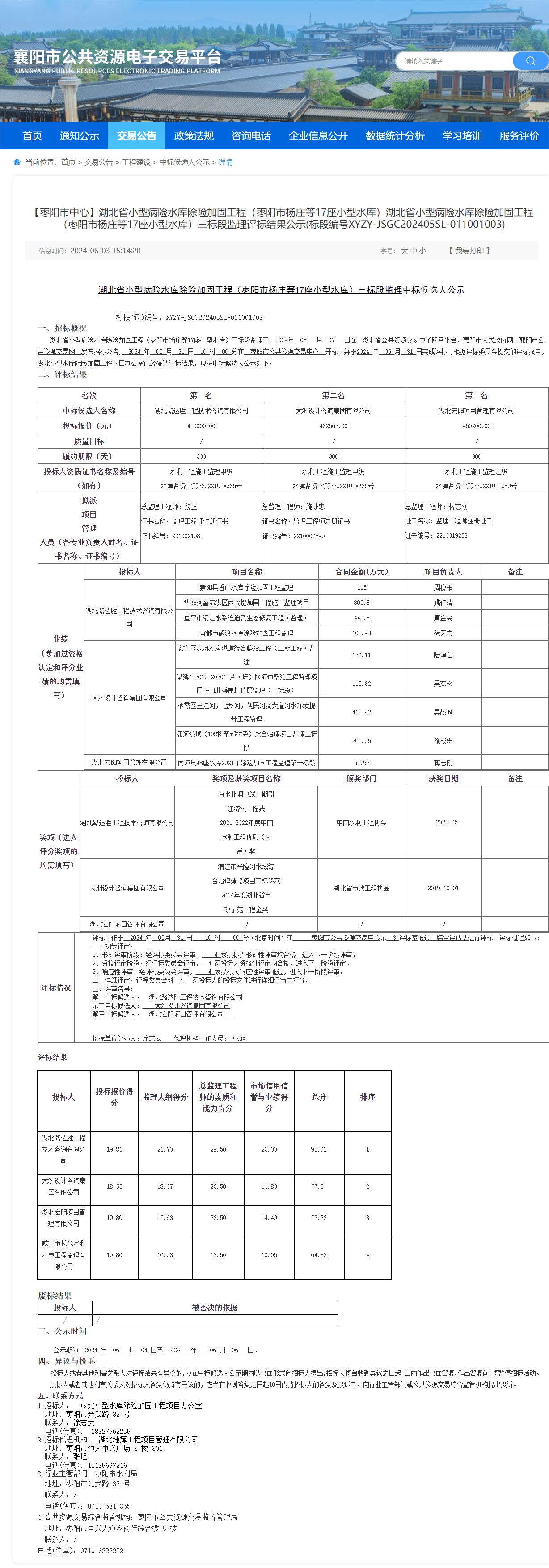 湖北省小型病险水库除险加固工程(枣阳市杨庄等17座小型水库)三标段监理于 2024年 05 月 07 日在 湖北省公共资源交易电子服务平台、襄阳市人民政府网、襄阳市公共资源交易网 发布招标公告, 2024 年 05 月 31 日 10 时 00 分在 枣阳市公共资源交易中心 开标,并于2024 年 05 月 31 日完成评标 ,根据评标委员会提交的评标报告,枣北小型水库除险加固工程项目办公室已经确认评标结果,现将中标候选人公示如下:
