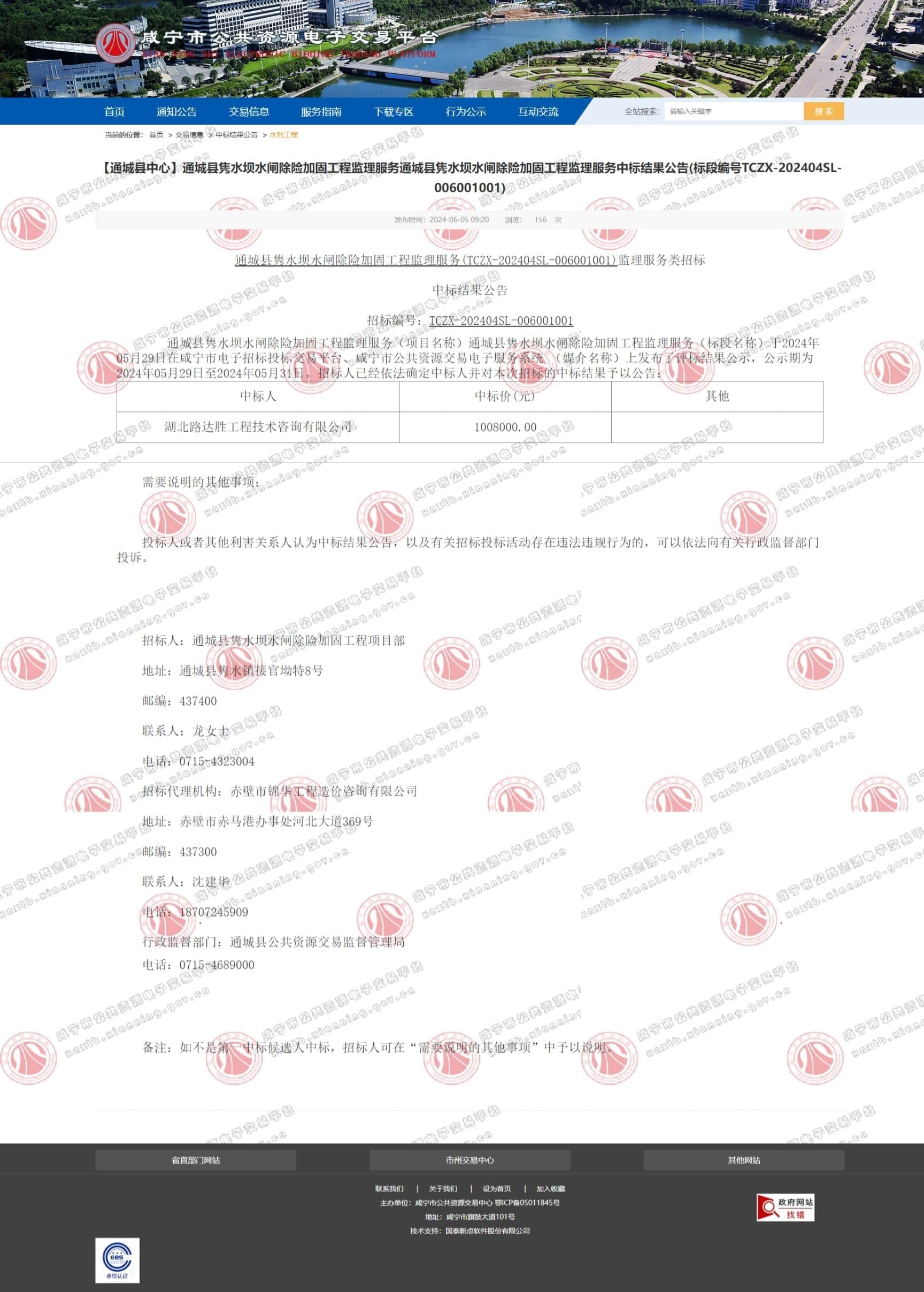 【通城县中心】通城县隽水坝水闸除险加固工程监理服务通城县隽水坝水闸除险加固工程监理服务中标结果公告(标段编号TCZX-202404SL-006001001)
