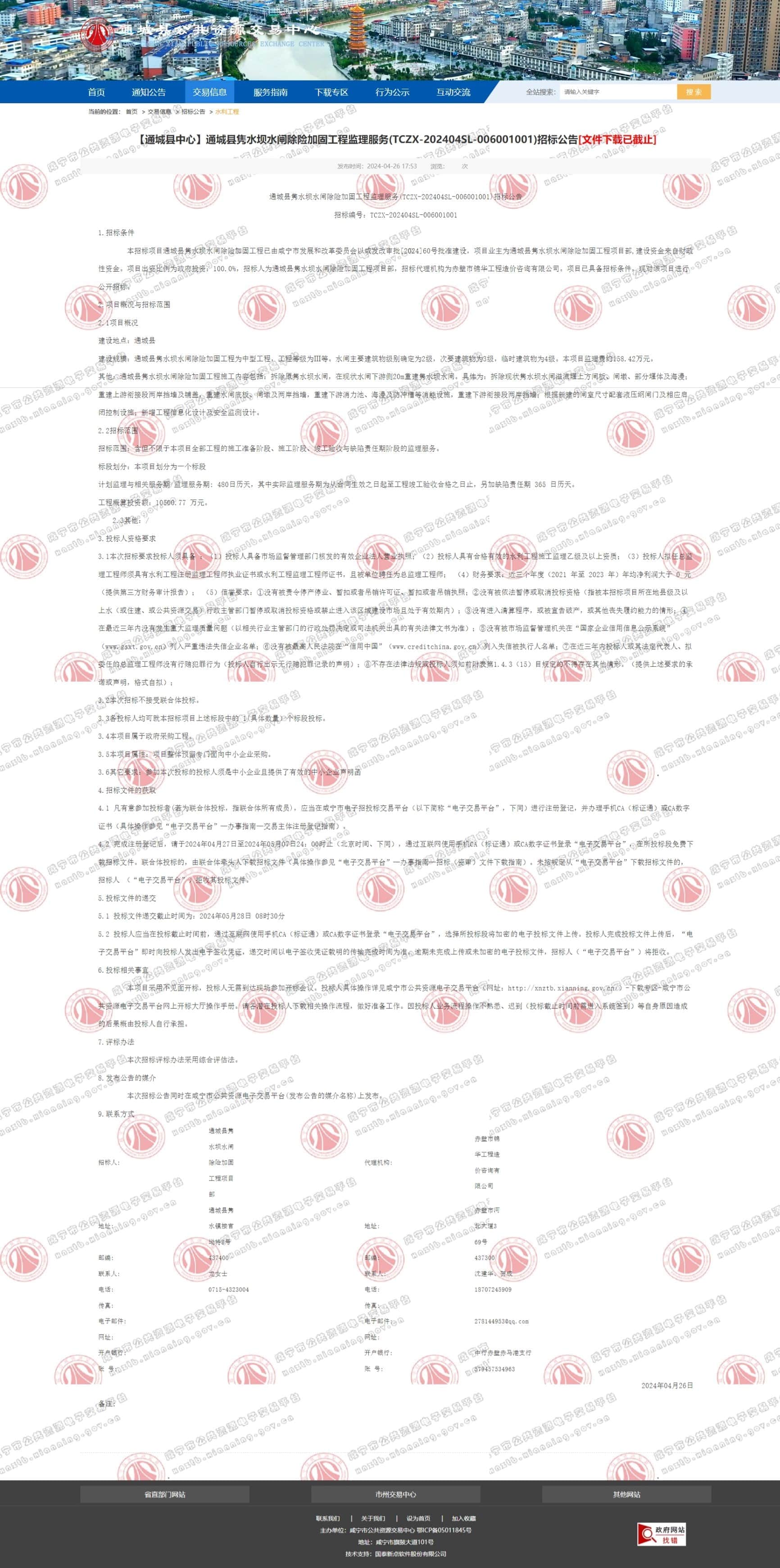 通城县隽水坝水闸除险加固工程监理服务(TCZX-202404SL-006001001)招标公告