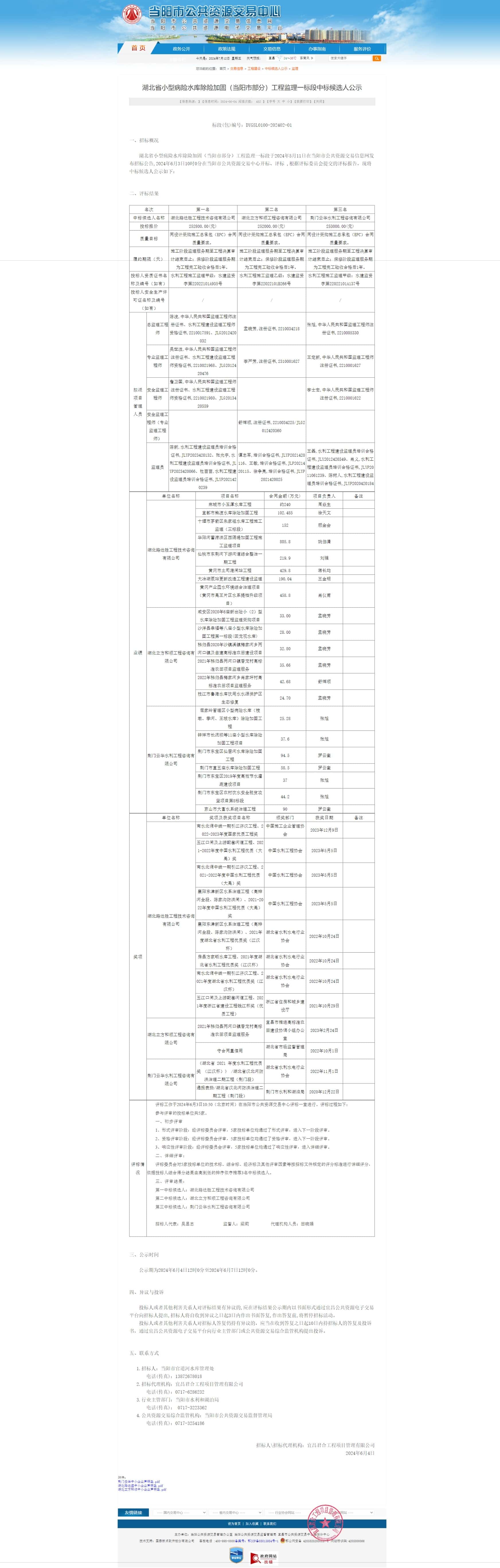 湖北省小型病险水库除险加固(当阳市部分)工程监理一标段于2024年5月11日在当阳市公共资源交易信息网发布招标公告,2024年6月3日10时0分在当阳市公共资源交易中心开标、评标 ,根据评标委员会提交的评标报告,现将中标候选人公示如下: