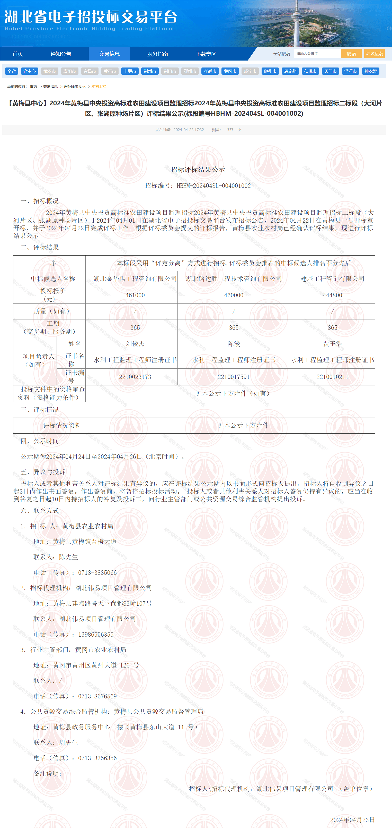 2024年黄梅县中央投资高标准农田建设项目监理招标二标段(大河片区、张湖原种场片区)评标结果公示