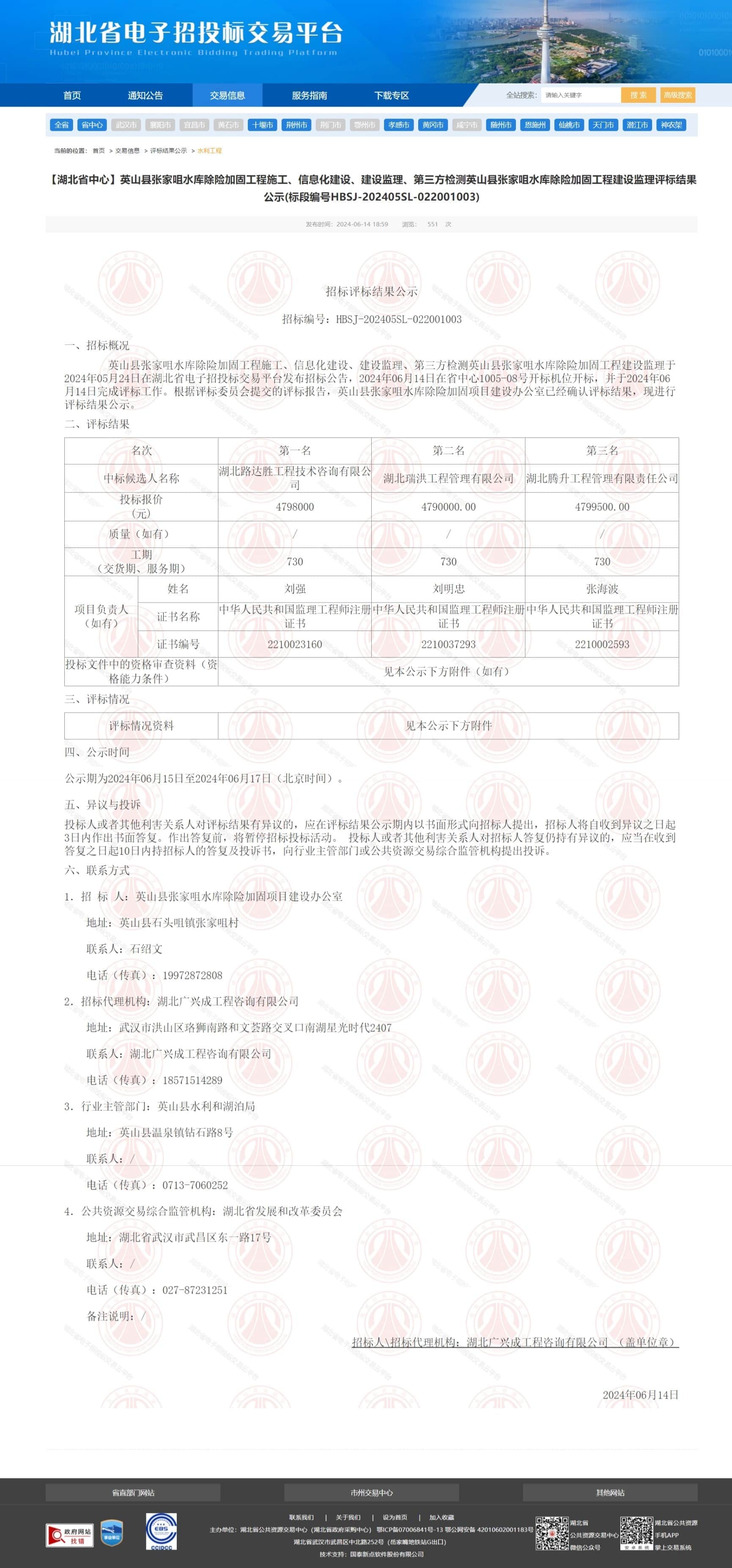 【湖北省中心】英山县张家咀水库除险加固工程施工、信息化建设、建设监理、第三方检测英山县张家咀水库除险加固工程建设监理评标结果公示(标段编号HBSJ-202405SL-022001003)