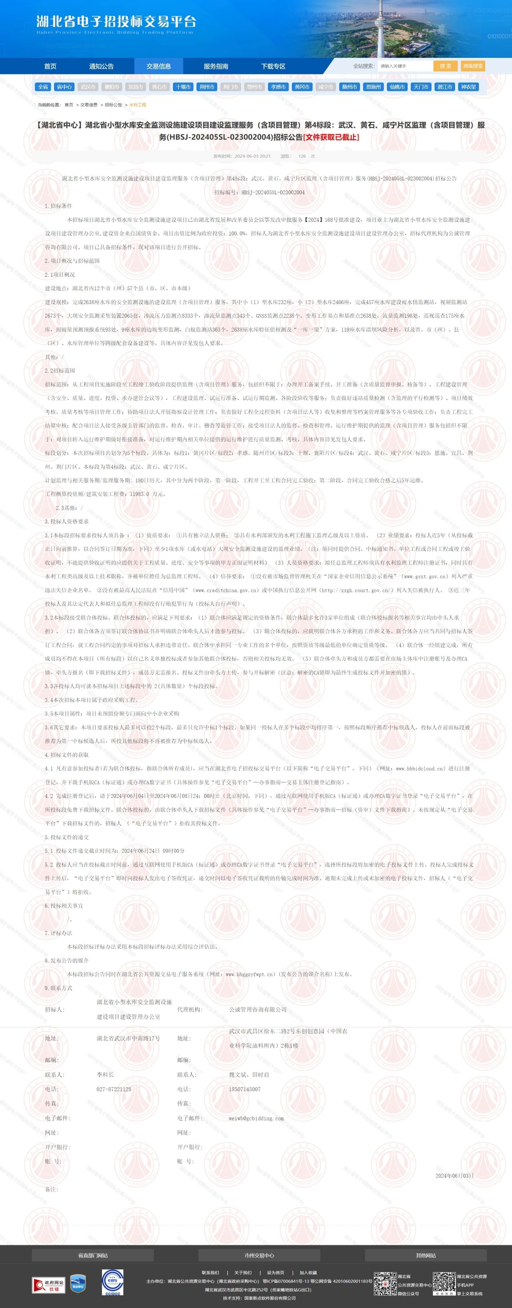 湖北省小型水库安全监测设施建设项目建设监理服务(含项目管理)第4标段:武汉、黄石、咸宁片区监理(含项目管理)服务(HBSJ-202405SL-023002004)招标公告