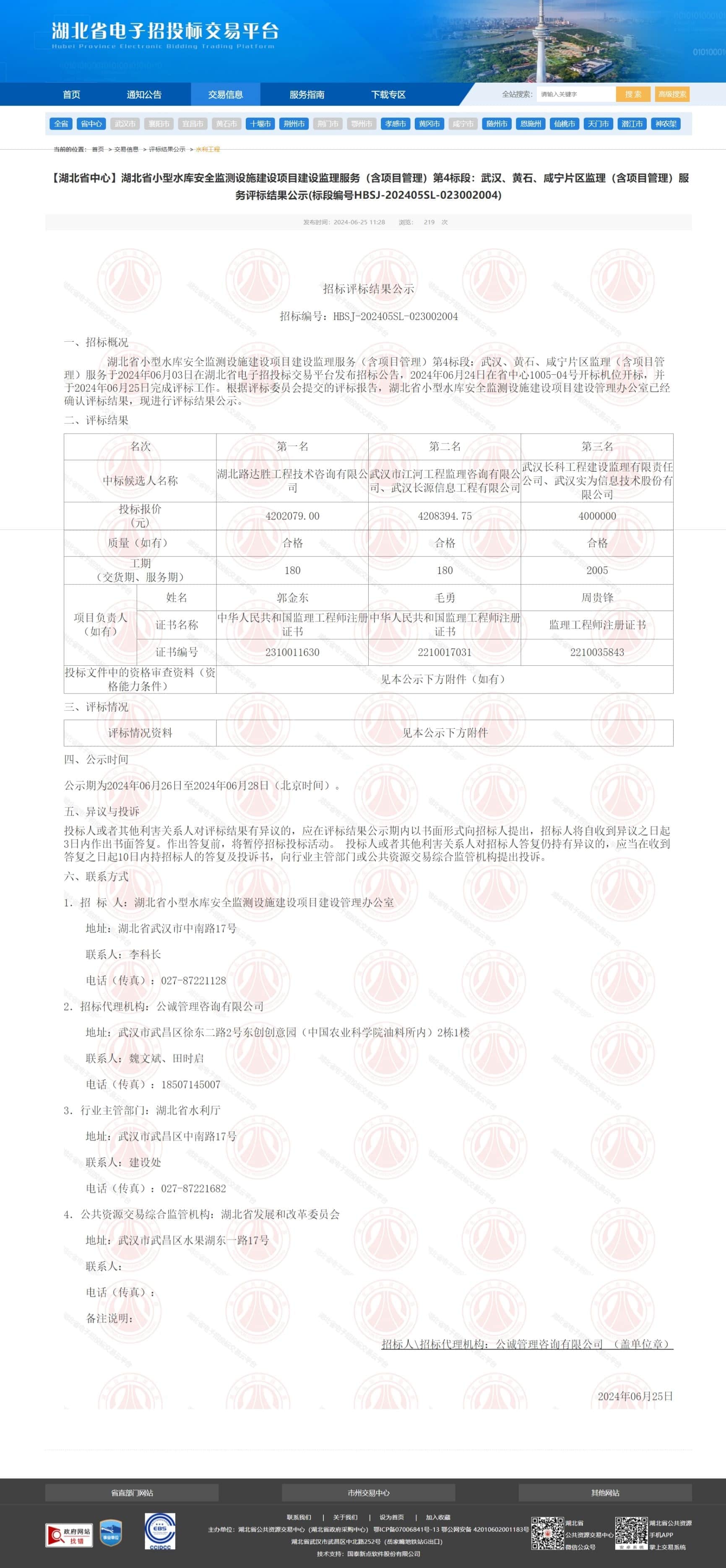 【湖北省中心】湖北省小型水库安全监测设施建设项目建设监理服务(含项目管理)第4标段:武汉、黄石、咸宁片区监理(含项目管理)服务评标结果公示(标段编号HBSJ-202405SL-023002004)