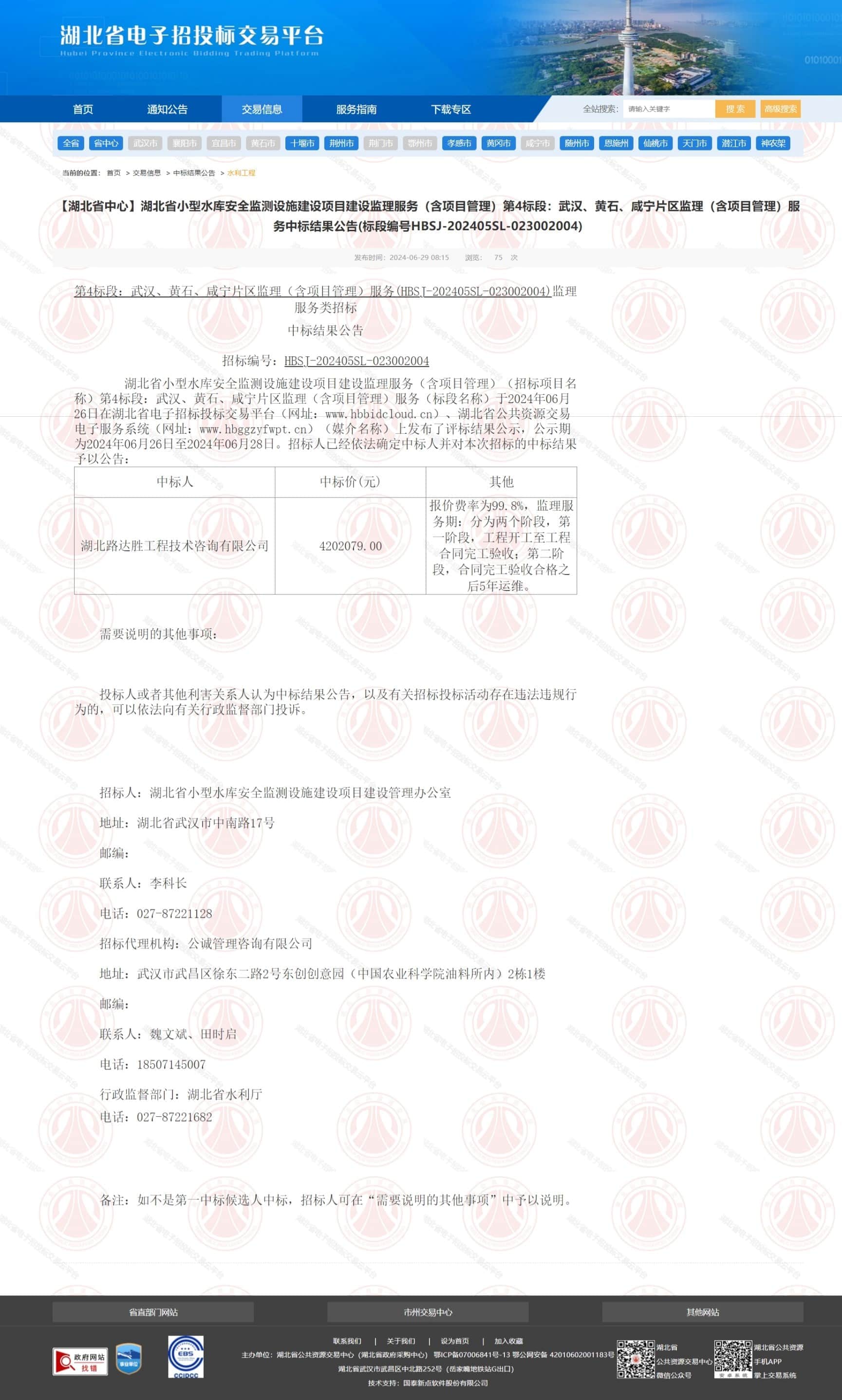 湖北省小型水库安全监测设施建设项目建设监理服务(含项目管理)(招标项目名称)第4标段:武汉、黄石、咸宁片区监理(含项目管理)服务(标段名称)于2024年06月26日在湖北省电子招标投标交易平台(网址:www.hbbidcloud.cn)、湖北省公共资源交易电子服务系统(网址:www.hbggzyfwpt.cn)(媒介名称)上发布了评标结果公示,公示期为2024年06月26日至2024年06月28日。招标人已经依法确定中标人并对本次招标的中标结果予以公告: