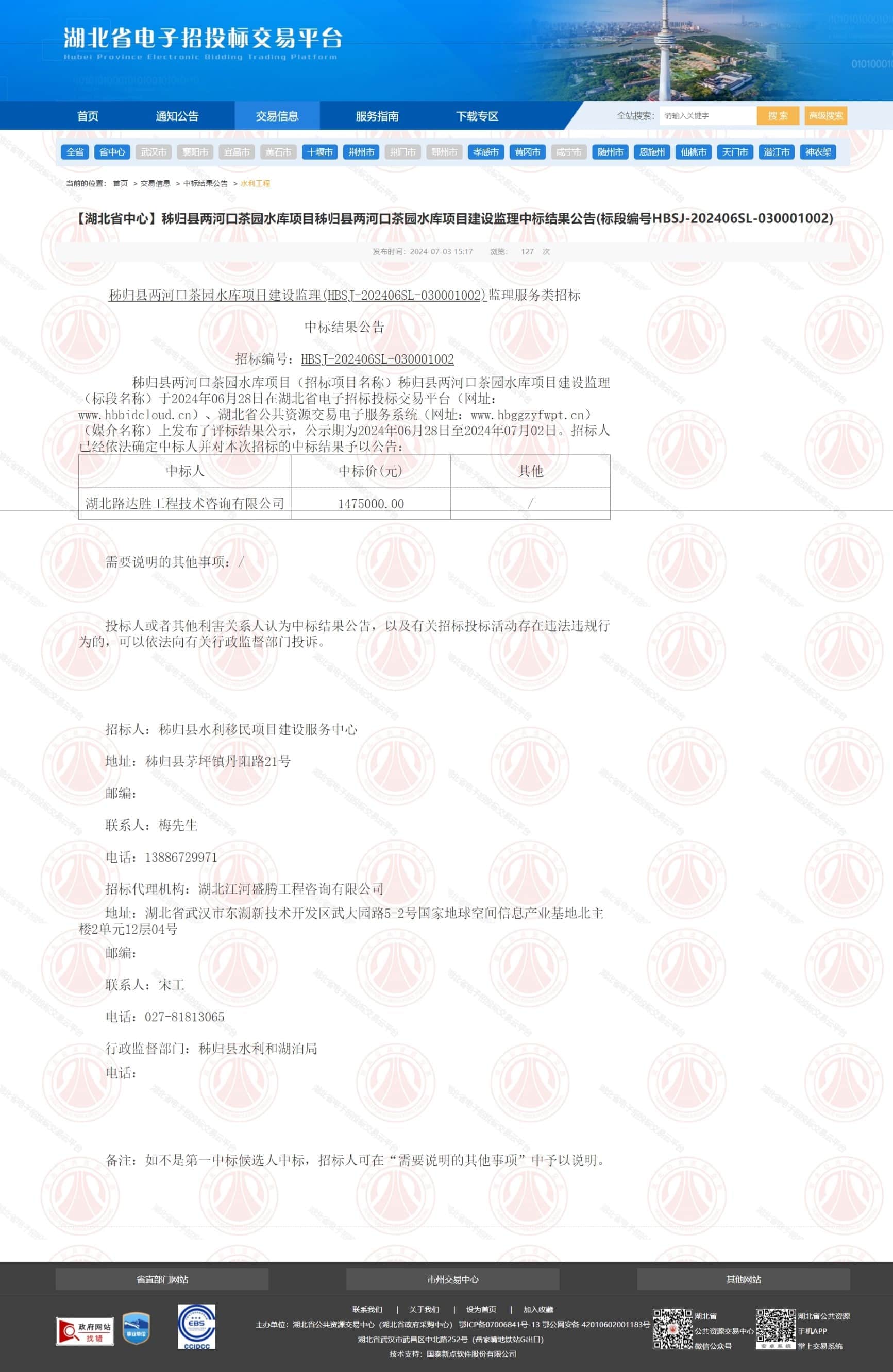 【湖北省中心】秭归县两河口茶园水库项目秭归县两河口茶园水库项目建设监理中标结果公告(标段编号HBSJ-202406SL-030001002)